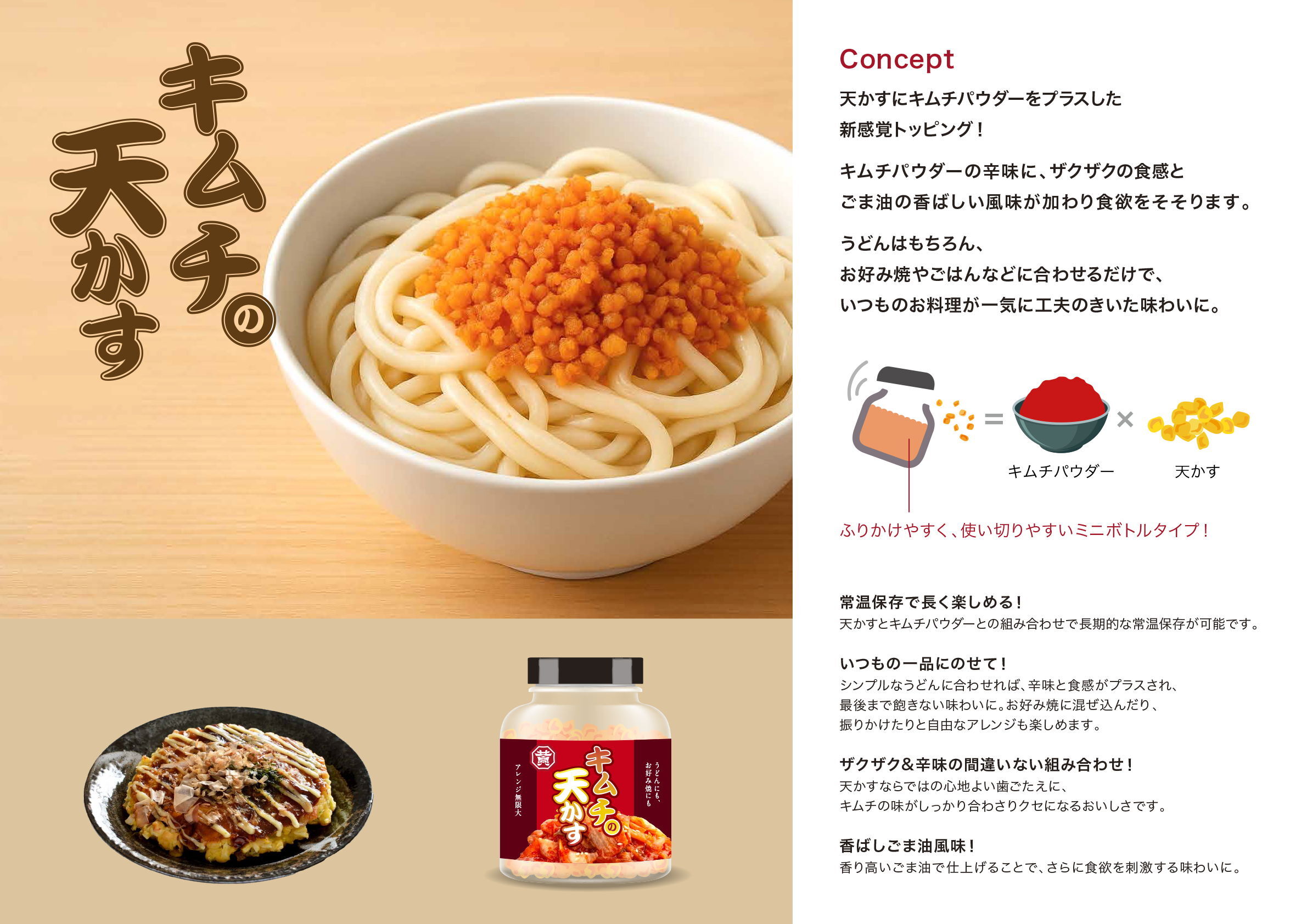 このたびは数ある魅力的な候補の中から「キムチの天かす」を選出いただき、誠にありがとうございます。今回のプロセスでは多様なアイデアを検討し、キムチという食材の奥深さ、おもしろさを改めて発見することができました。チームで様々なアイデアを出し合う時間は、とても刺激的で学びの多いものとなりました。
