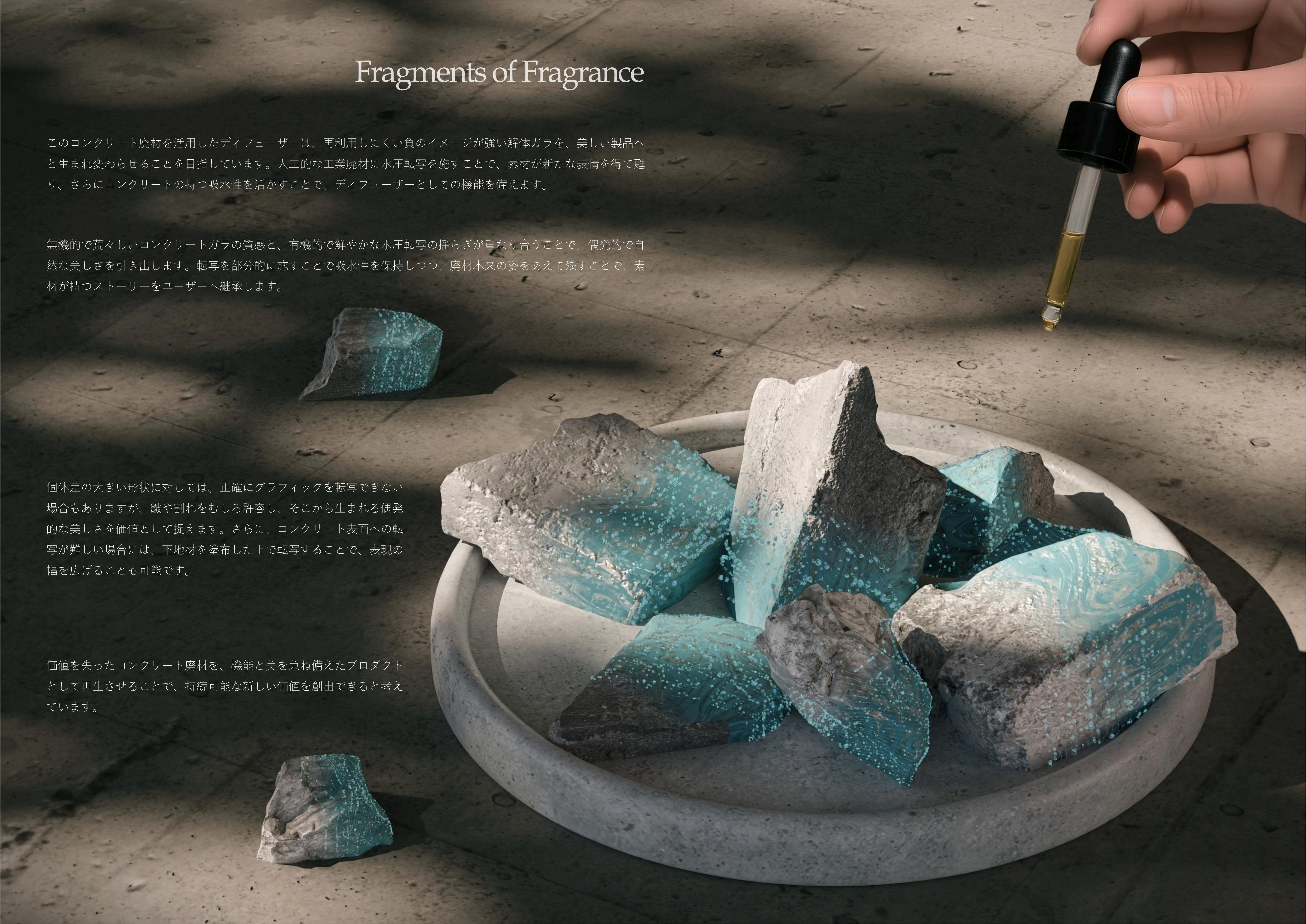 このたびは多くの提案の中から選んで頂きまして、誠にありがとうございます。コンクリート廃材という再利用が難しい素材を、水圧転写技術によって新しい価値へと変換する提案が評価されたことを大変嬉しく思います。今後は企業の皆様と共にプロトタイプ制作を進め、持続可能で美しいプロダクトの実現を目指してまいります。