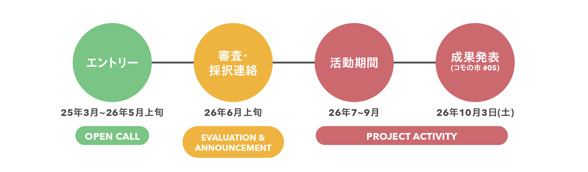 ⚫︎採択された場合、ComoNe事務局主催のプログラム、こもごも会議(※1)、コモの市(※2)、各種イベントへの参加、日常的な活動がComoNeで実施ができること。(※)