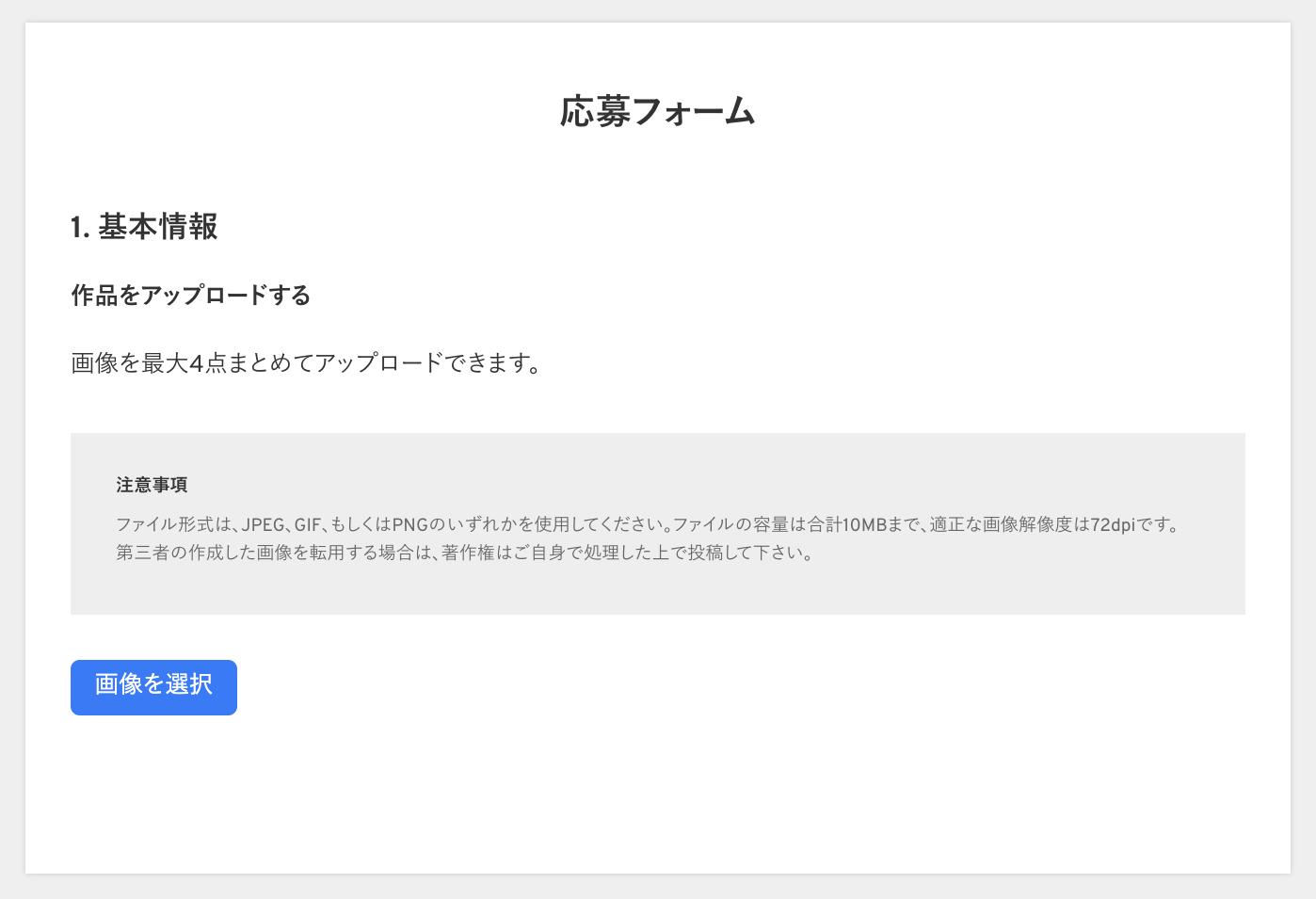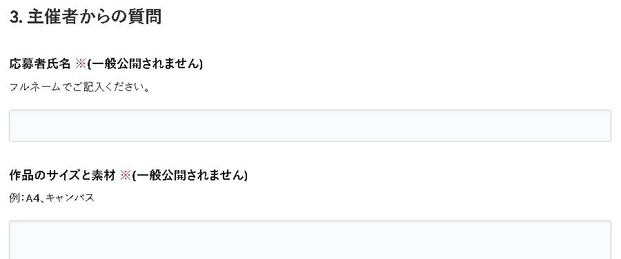 ⑥お名前やご連絡先を入力してください。(賞品発送時や 本プロジェクトに関するご連絡時に使用いたします。) ※「作品のサイズと素材」と「作品に使用した画材」には「なし」とご入力ください。