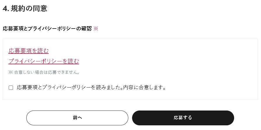 ⑦確認事項にチェックを入れ、応募規約・プライバシーポリシーをよく読み同意の上、「応募する」ボタンを押してください。