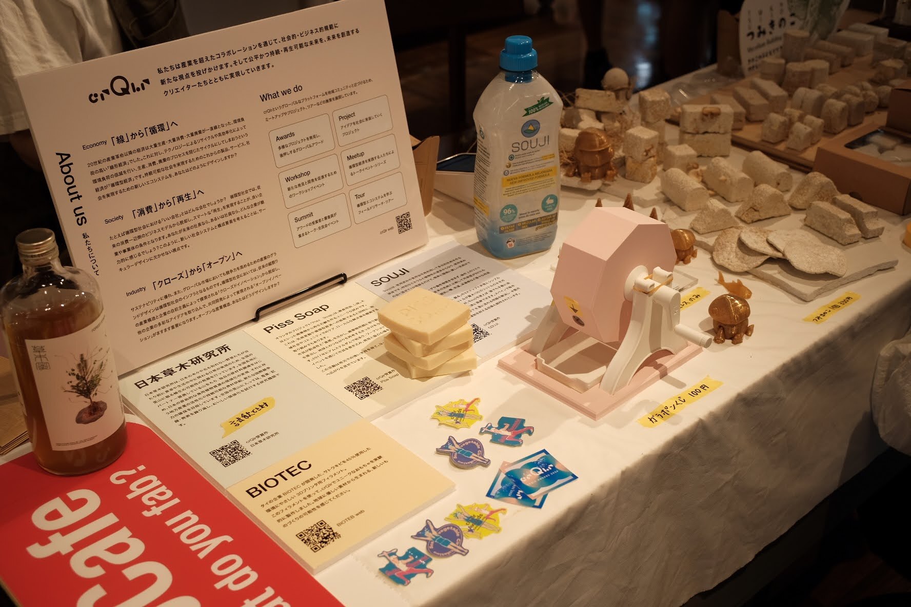 FabCafe Nagoyaでは、店舗を飛び出し「環境デーなごや2025」会場にて展示を実施。環境意識の高い市民や企業、学生に向けて、crQlr Awardsの受賞プロジェクトのPiss Soap、SOUji、日本草木研究所が紹介されました。