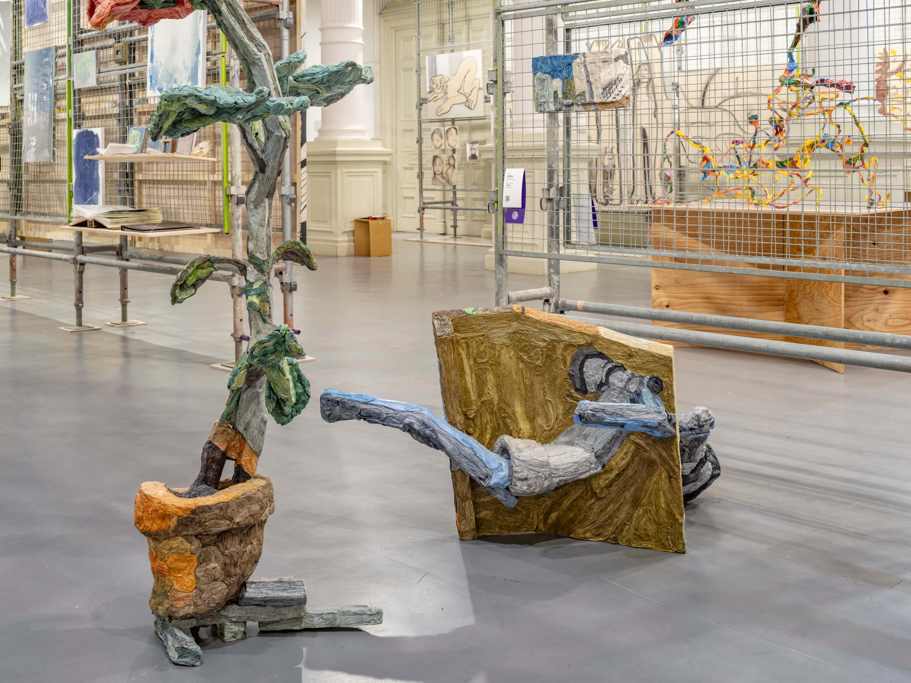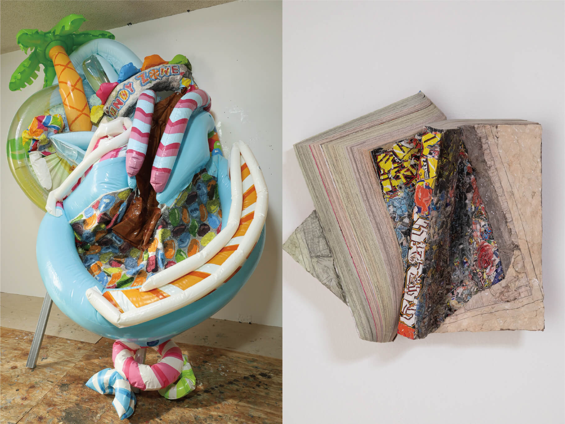 その影響もあってか、2025年は私の制作が大きく変化しました。これまでは染めた紙のみを制作の母材として扱い、自分の中で絵画と彫刻の構造を向かい合わせていましたが、最近は漫画やビニールプールといった既製品の絵に注目し、絵画と彫刻、形態と表象といった関係性に対してより共有できるリテラルなあり方が制作に用いられるようになりました。「歪曲張り子」を中心とするこれまでの制作が自分の中で実り始め、展開を起こすことができています。