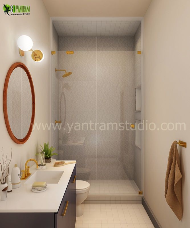 Yantram Interior Design Studio has collection of stylish and modern interior design ideas for your Bathroom. 3D Yantram designs photorealistic Small bathroom rendering calls for space saving and functional solutions, elegant and compact layout and light room colors.