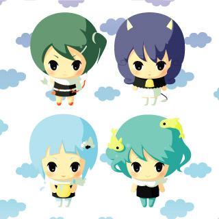 星座イラストの一部です。こちらはいて、やぎ、みずがめ、うおの四人です。