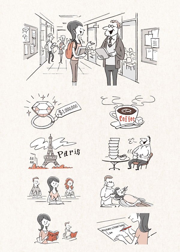 金星堂さんより発行の 2017年 英語テキスト 『English Aid』基礎から学べる大学英文法総合演習の2色イラスト136点を描かせていただきました。