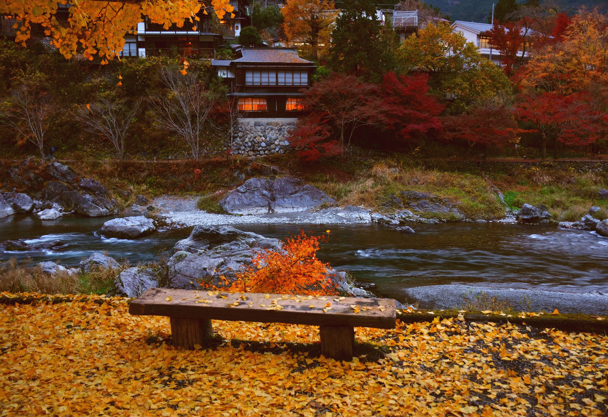 A yellow fallen leaf of gingko nut is laid out on an esplanade in a ravine.