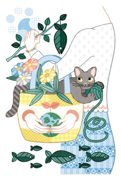 カラフル イラスト デザイン 猫 人物 バッグ 花 植物 葉っぱ 地球