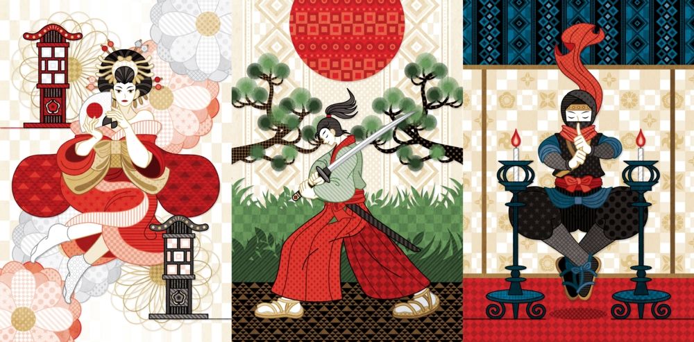 花魁と行灯・侍と刀と松と日の丸・忍者と燭台(リメイク)