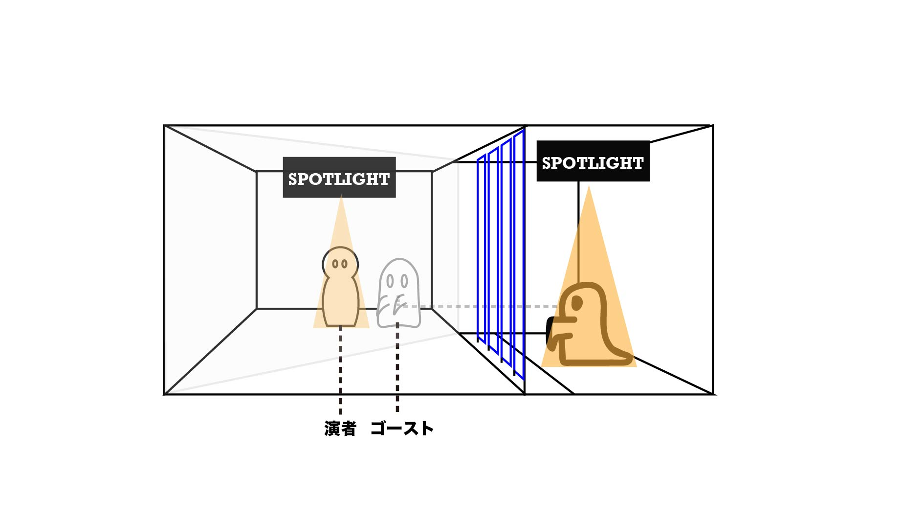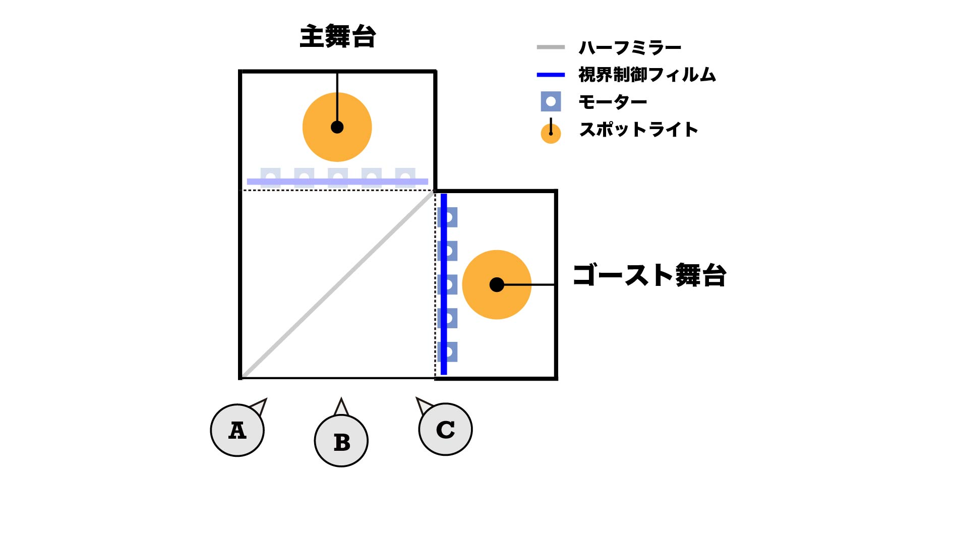 で制作した舞台機構である。本作品では、中央からは女性のみが観賞できるが、右側(上手側)から観賞 すると女性の背後に男性が、左側(下手側)から観賞すると椅子の上に首のない男性が現れる。このよう に見る角度に応じて登場するキャストが異なるといった超常的な観賞体験を可能にし、同じ舞台作品で あっても物語の解釈が変化させられる。本作のシステムは2つの舞台空間の間にハーフミラーを隔て、片方 の舞台上の物体を半透明の反射像としてもう片方の舞台に重畳させるペッパーズ・ゴーストの原理と、視 線方向に応じて透明度が変化するプライバシー保護のための建築素材である視界制御フィルムとの組み合 わせで成り立つ。つまり、視界制御フィルムによって特定の方向からのみ反射像(ゴースト)が観賞でき る。さらに、視界制御フィルムをモータに取り付けて主導的に角度制御することで、所望の観客位置に対 してゴーストの可視・不可視を切り替えられる。以上により、これまでにない観劇体験を実現する意味を 込めて古代ギリシャ語で幽霊を指す”phantasm”と自身の名前をかけ合わせた名をつけた。