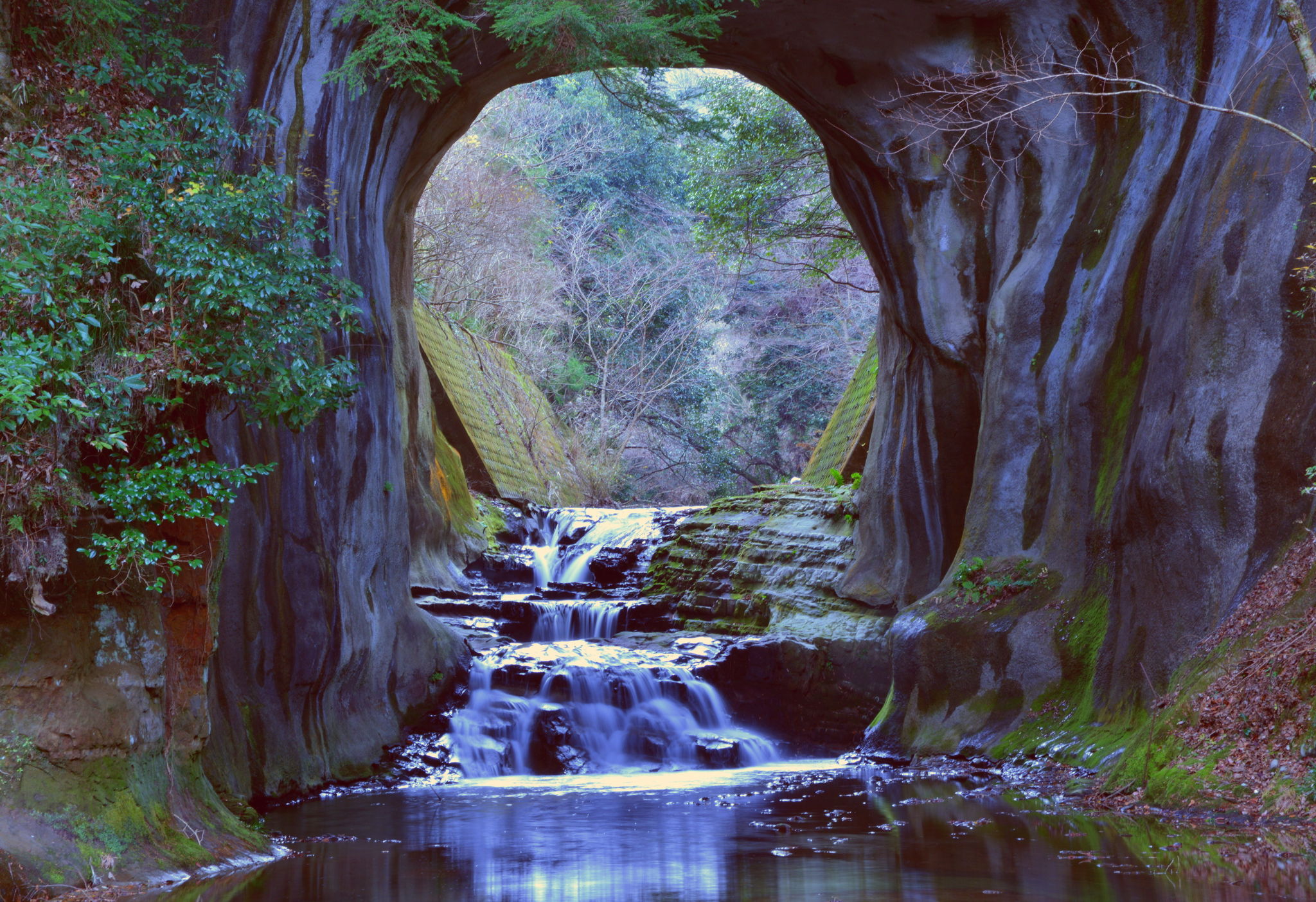 It's said that the cave in a waterfall in this dark ditch was made artificially.