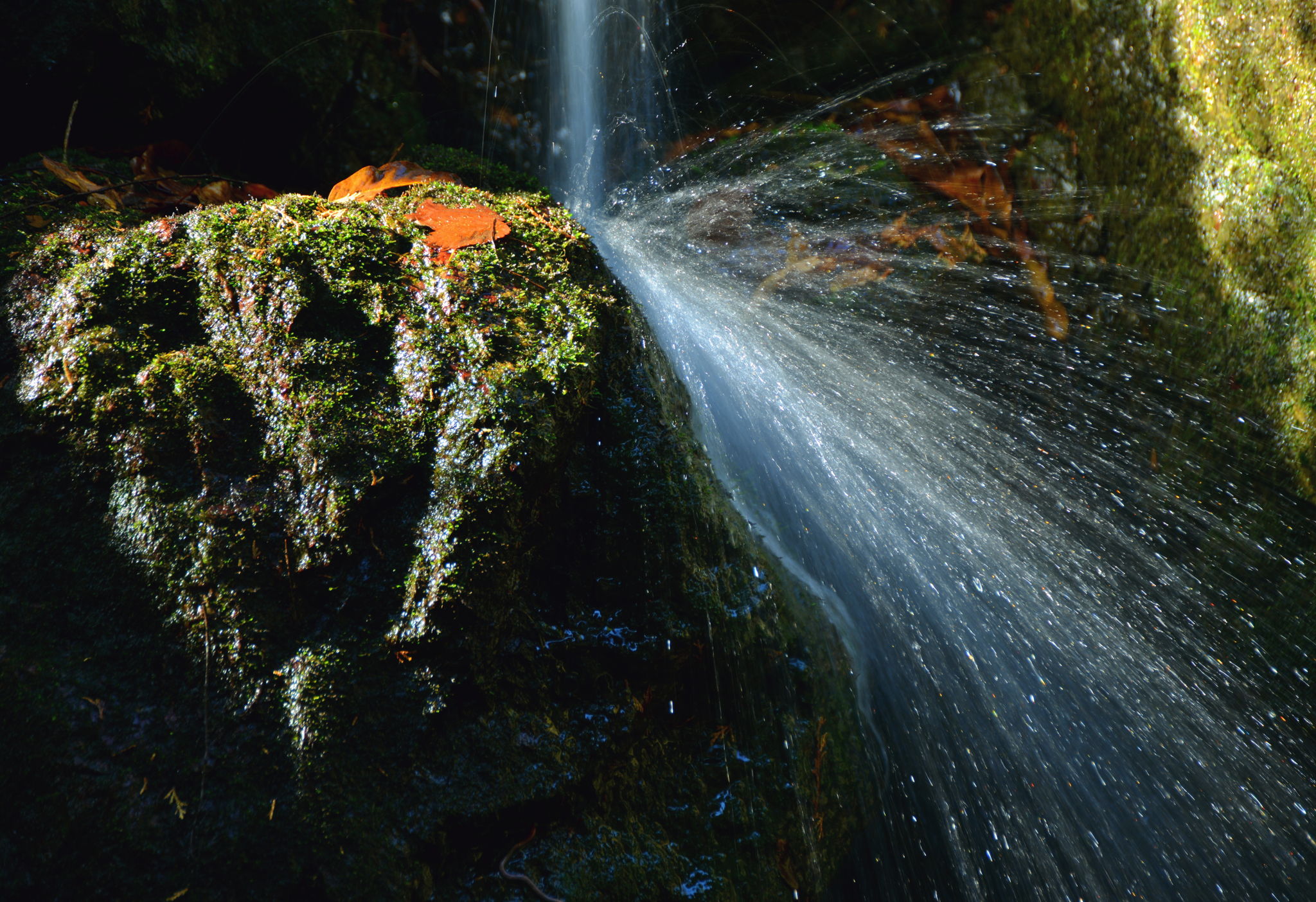 After water drops forcefully from a small waterfall in a swamp.