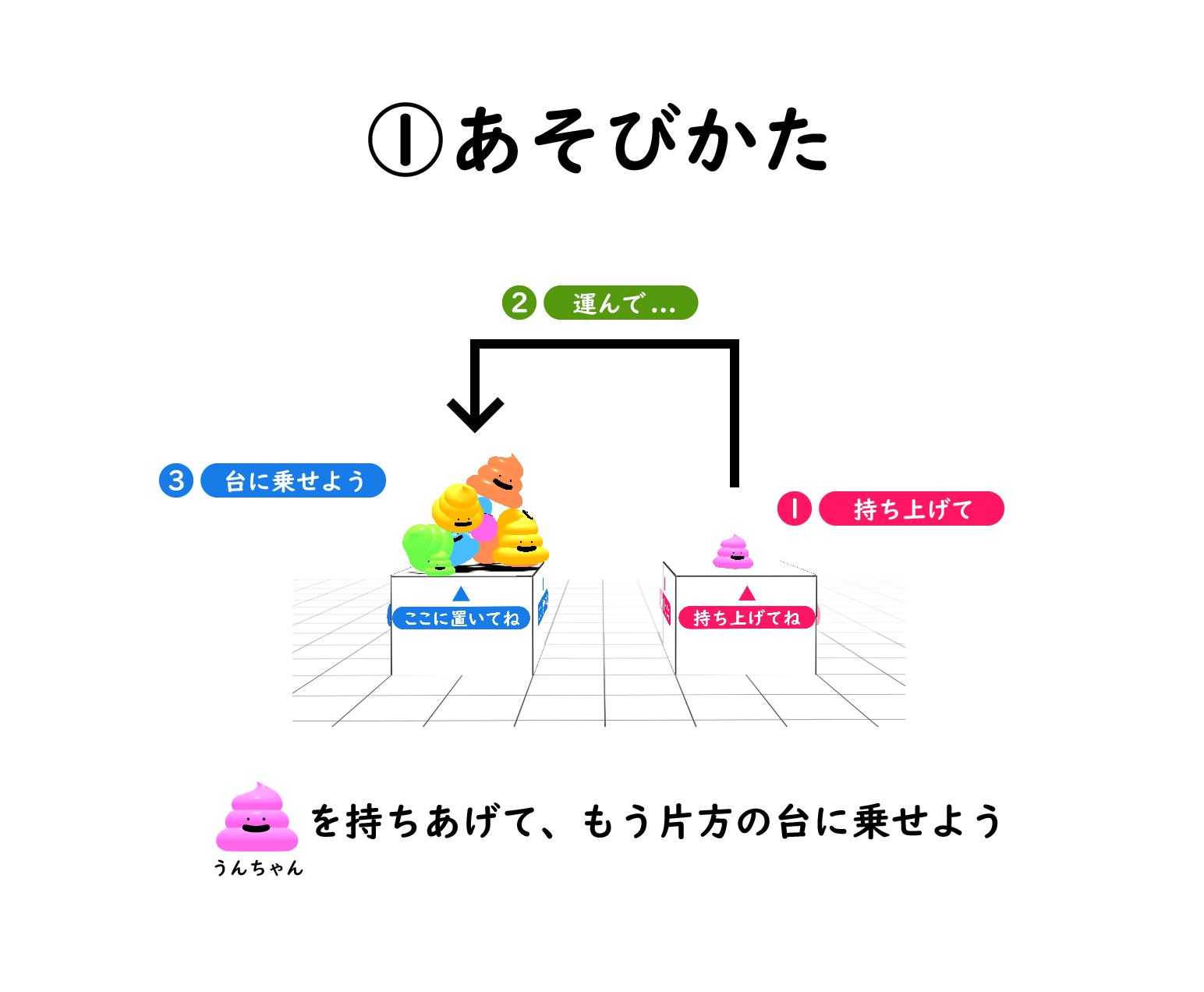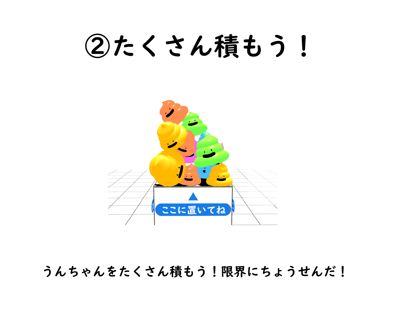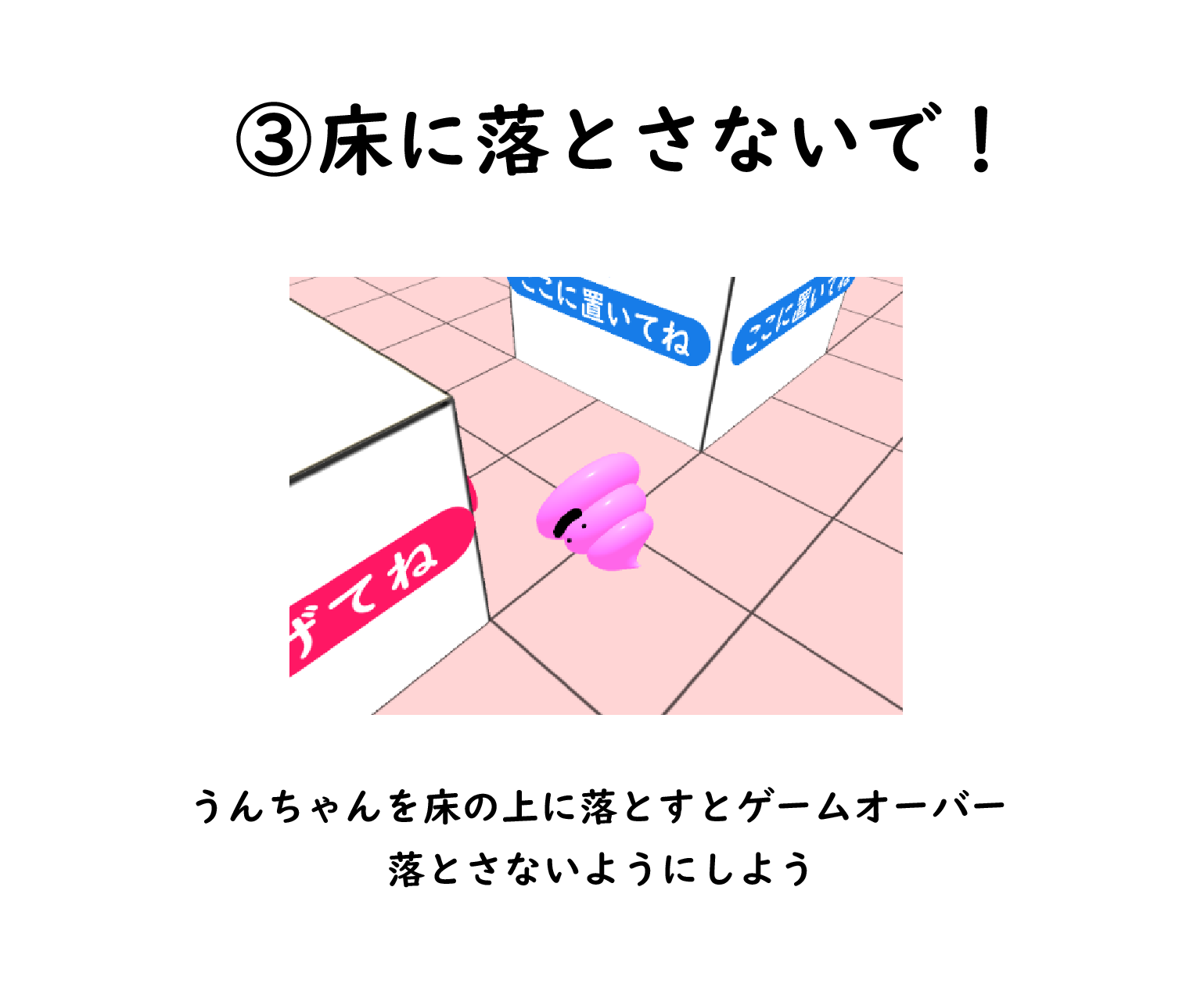 今回のゲームは、うんちゃんを床に落とさないように積み上げていくゲームです。