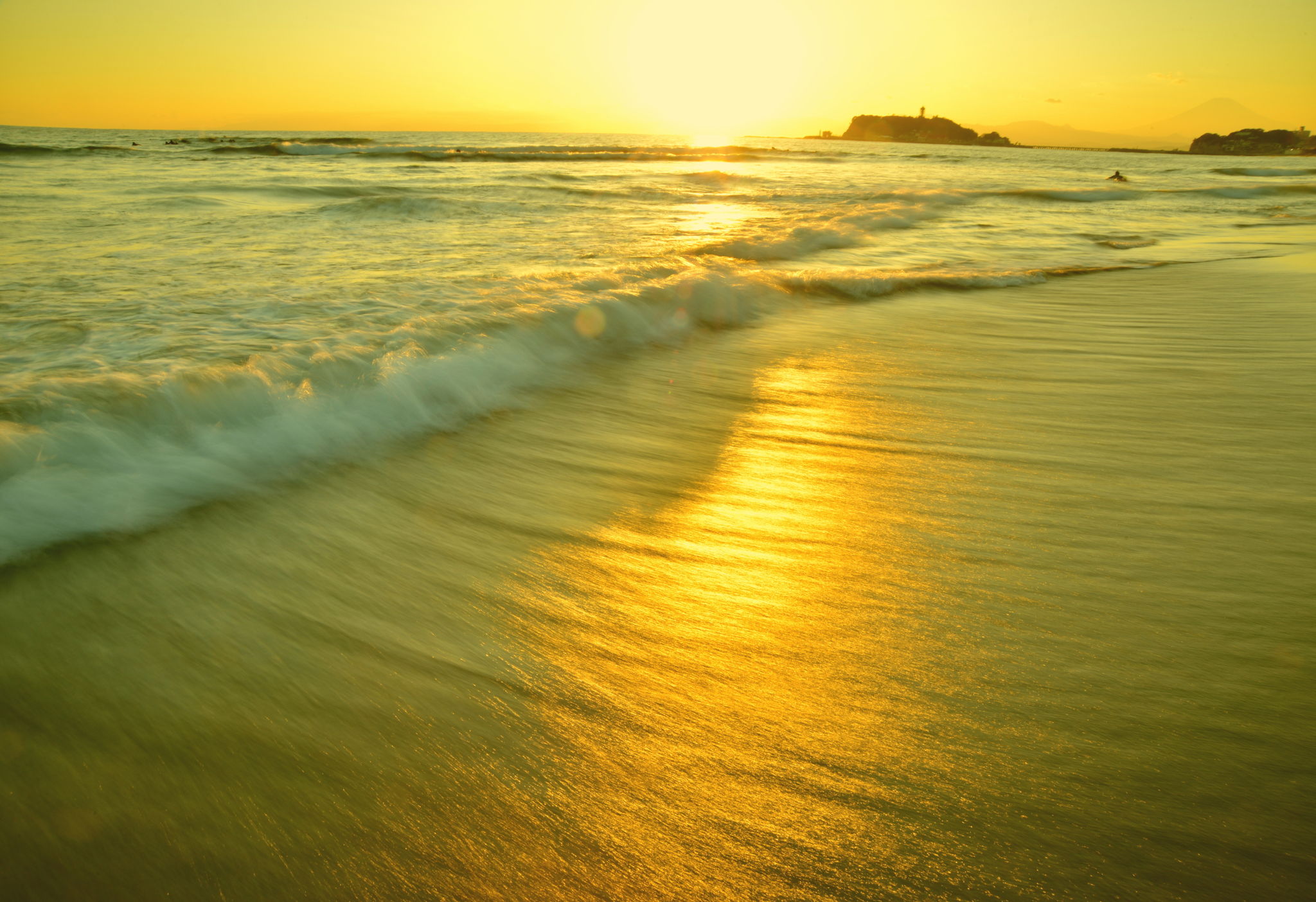The blaze the sunset lights up the sandy beach a wave pulled, and which is beautiful