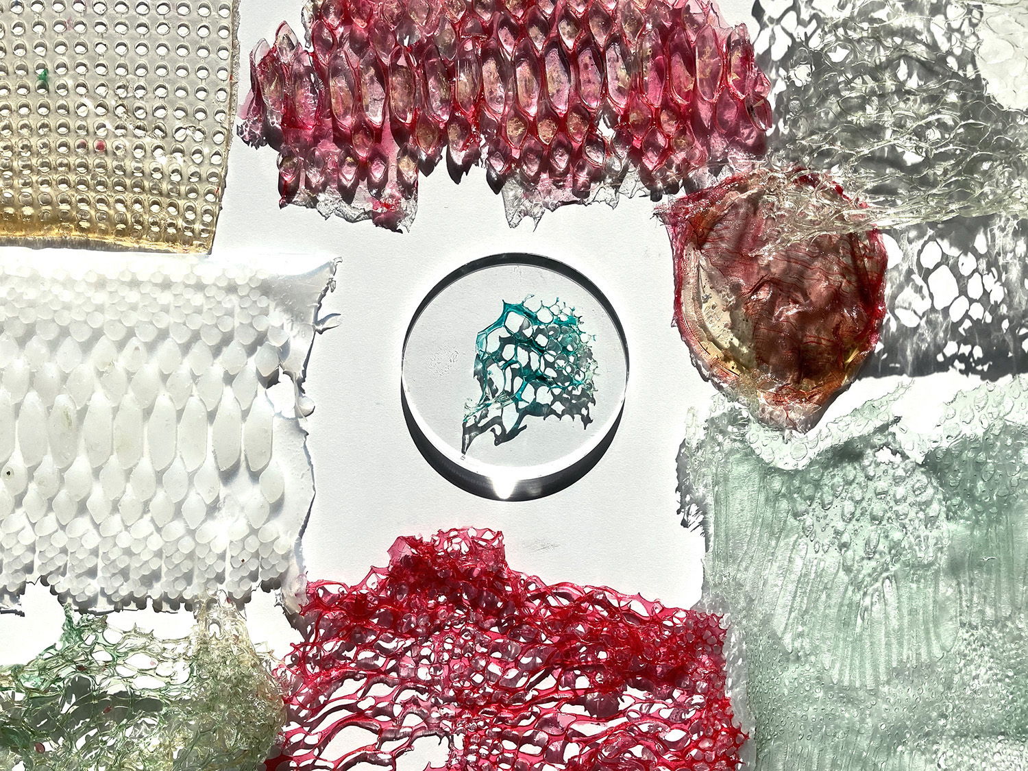 ‘Decomposition of Materiality’ speculates a simulated ecosystem where biomaterials grow, decompose and shift form as they are exposed to the elements. A result of intense experimentation and development in a laboratory, this sensitive, reactive material is crafted from algae extract and silk cocoon protein (sericin), a bio waste which is commonly discarded in industrial wastewater from textile manufacturing. It responds directly to its environment and is able to fully biodegrade in alkaline water within 24 hours. With a key focus on sustainability, the project utilised 3D technologies to generate models of the textile’s shape, to digitally fabricate a casting mold, and to exhibit the garment textiles - also serving to consciously minimise waste, contrasting to the fashion sector’s unsustainable nature. This virtual existence means once the garment’s physical material vanishes its soul is uploaded into a new, digital life which is not only sustainable but also significantly more accessible. The project harnesses the powers of both nature and technology to display the beauty of natural life forms, challenging viewers with the concept of material life cycles and suggesting a new direction for sustainable fashion.