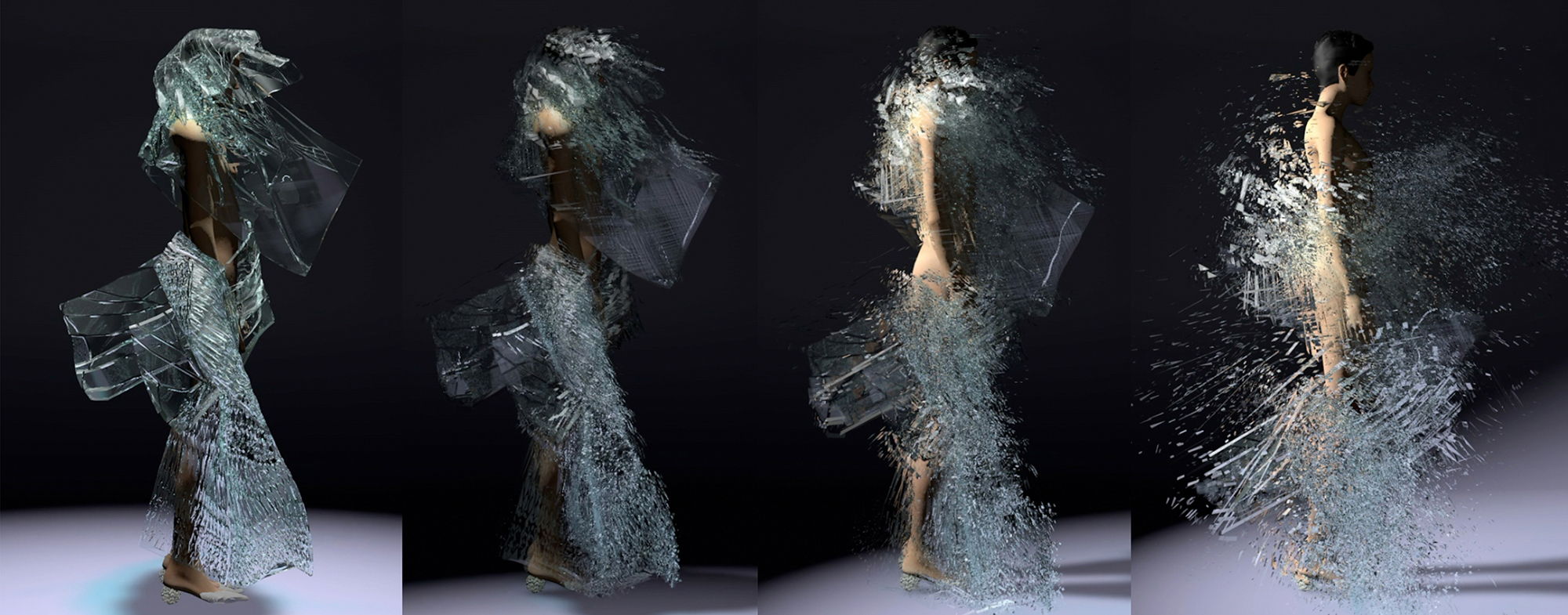 Much of the garment textile’s design was engineered using 3D technologies - an innovative alternative to the fashion industry’s waste problem. 3D modelling and rendering were used to simulate potential outcomes and textures, while 3D animation became one of the final presentation mediums, where the product was exhibited in a virtual showroom. As a result, the finite nature of the degradable textile is transformed into an endless digital artefact which can be accessed from all over the world. -