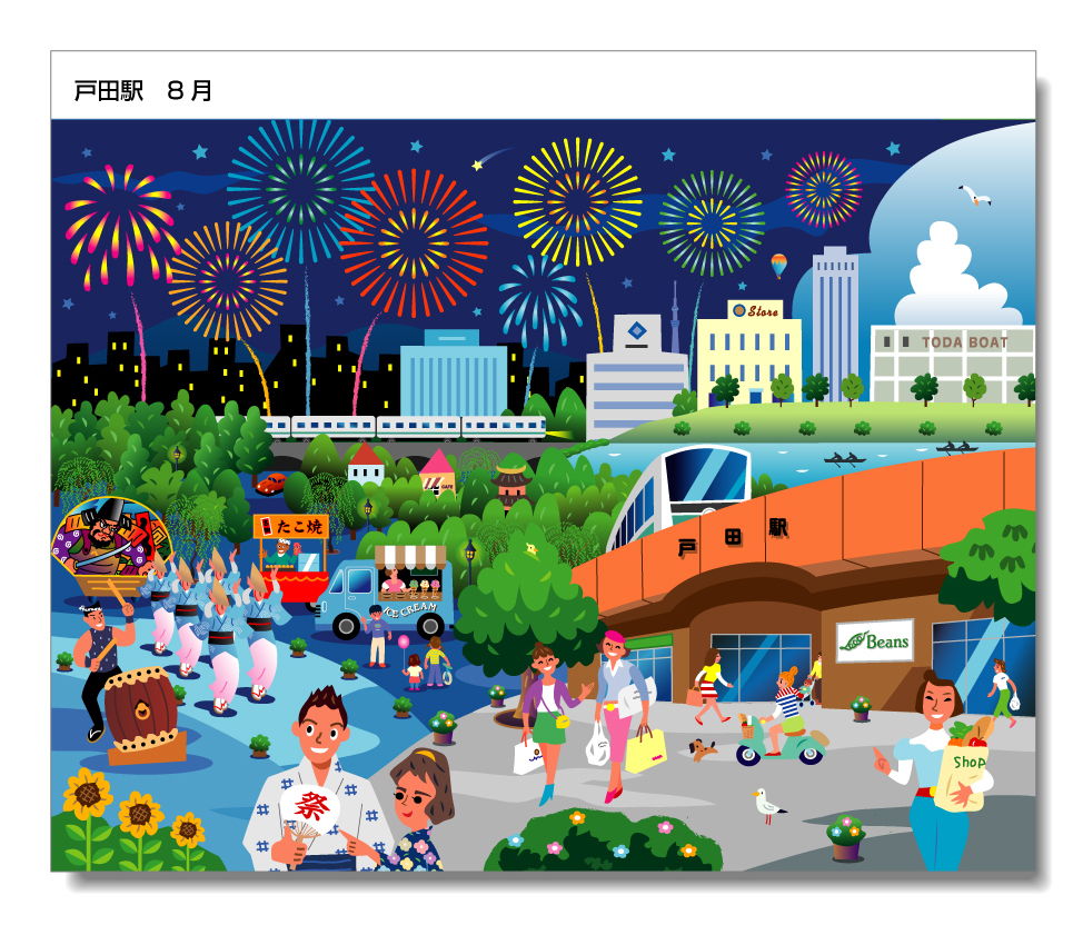 戸田駅周辺でクライアントが所有する施設や名所、催事などをオムニバス形式で表現したものです。