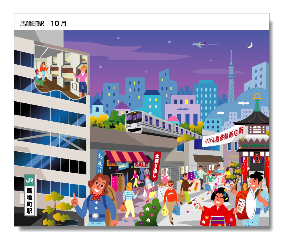 馬喰町駅周辺でクライアントが所有する施設や名所、催事などをオムニバス形式で表現したものです。