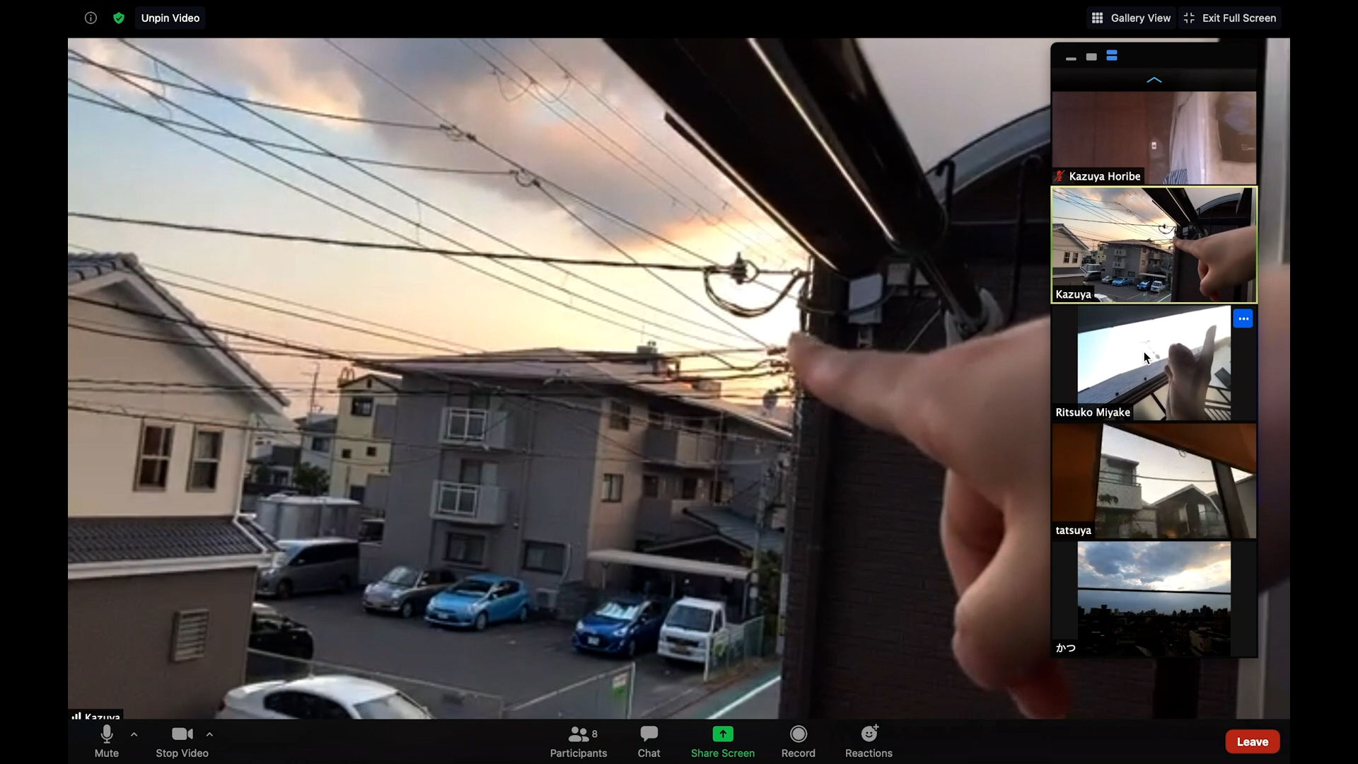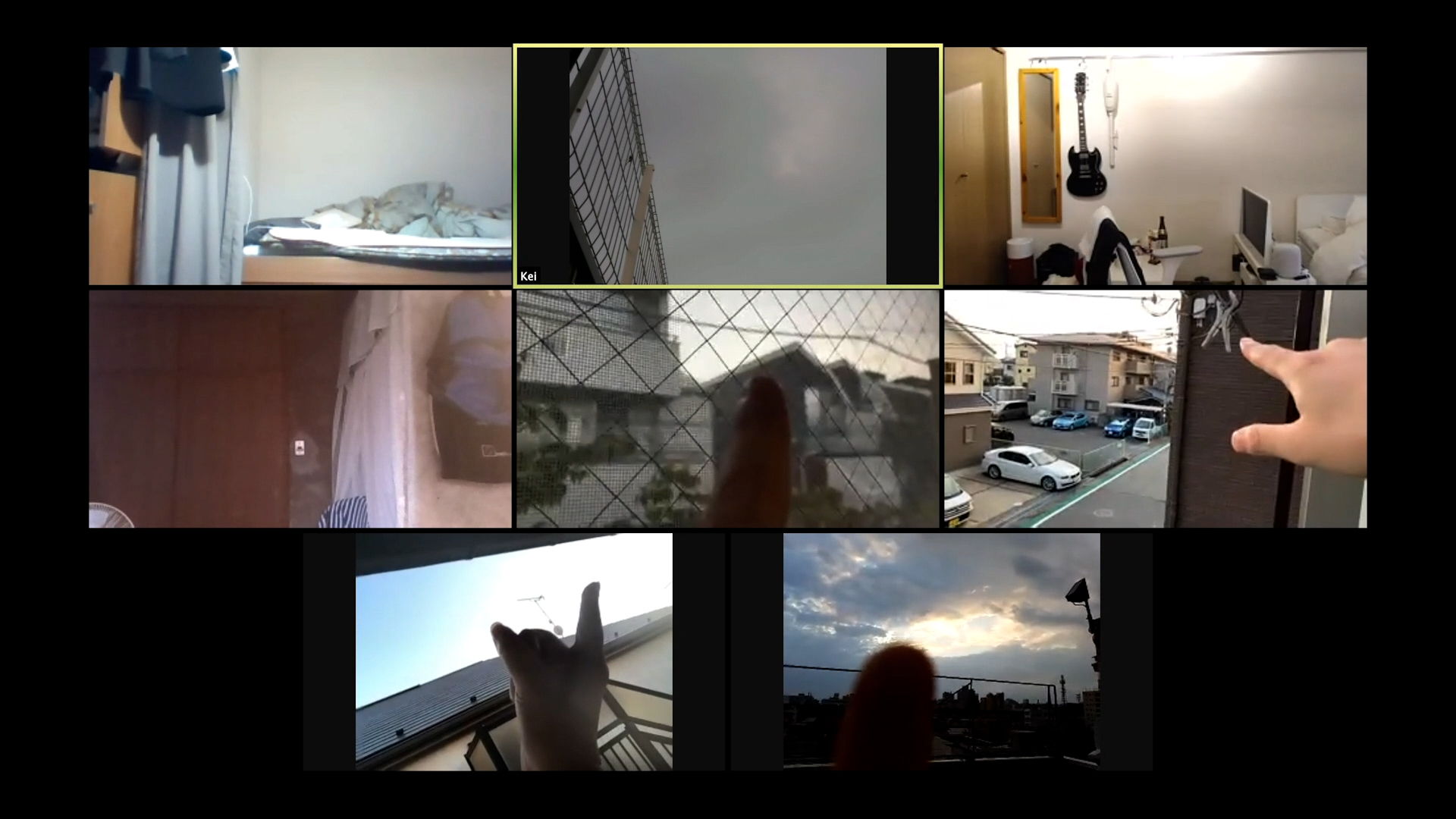 スマホでZOOMにアクセスして、デスクから立ち上がり窓から太陽を写してもらう。バーチャルな社会の中で私たちが共有できる現在は、現実にある太陽だった。天気の差異によって違って見える同一のオブジェが、外に出る日常を望む象徴のようだった。PCのアカウントは誰もいない部屋を写し続け、時間が止まったように固定されたPC画面と、POVのように活発に動くスマホのカメラ画面が対比を生み出し、1人の人間が脱皮して新たなアカウントに生まれ変わるように示す。