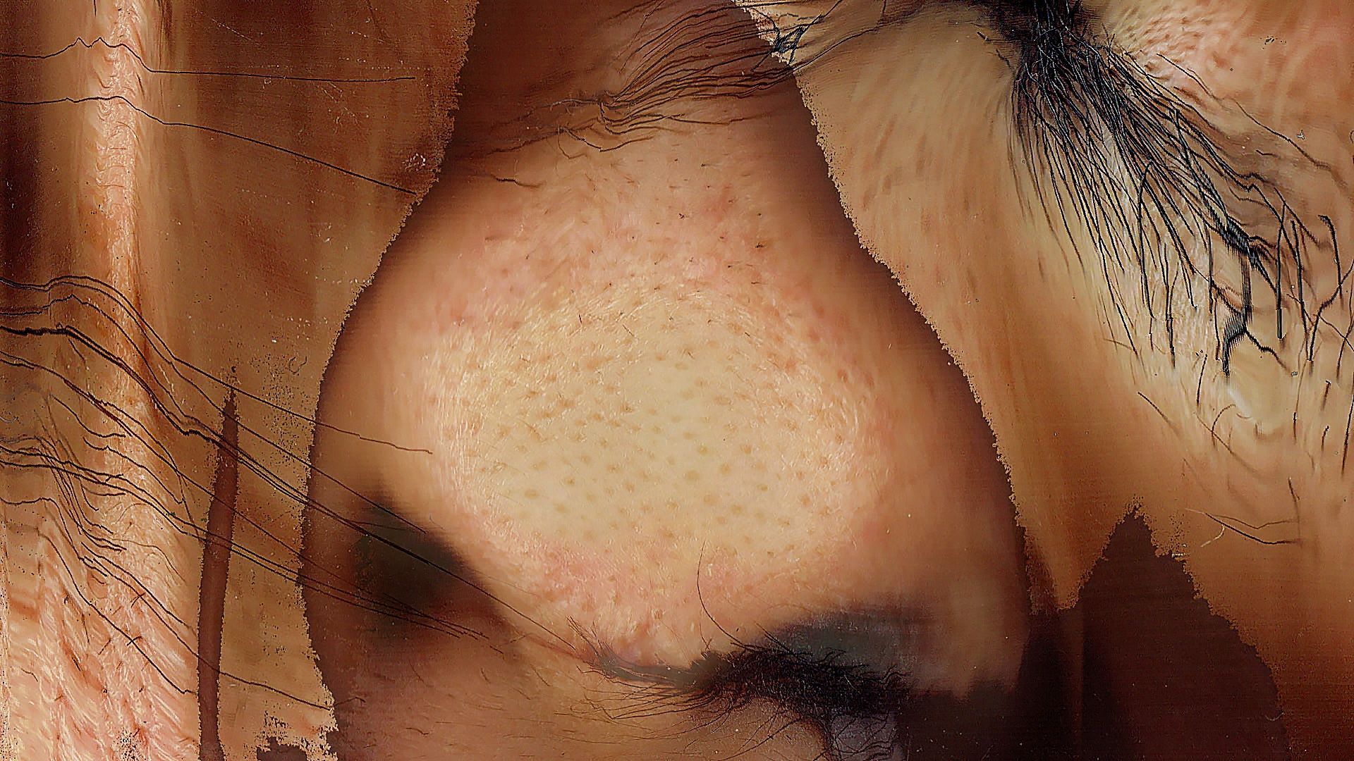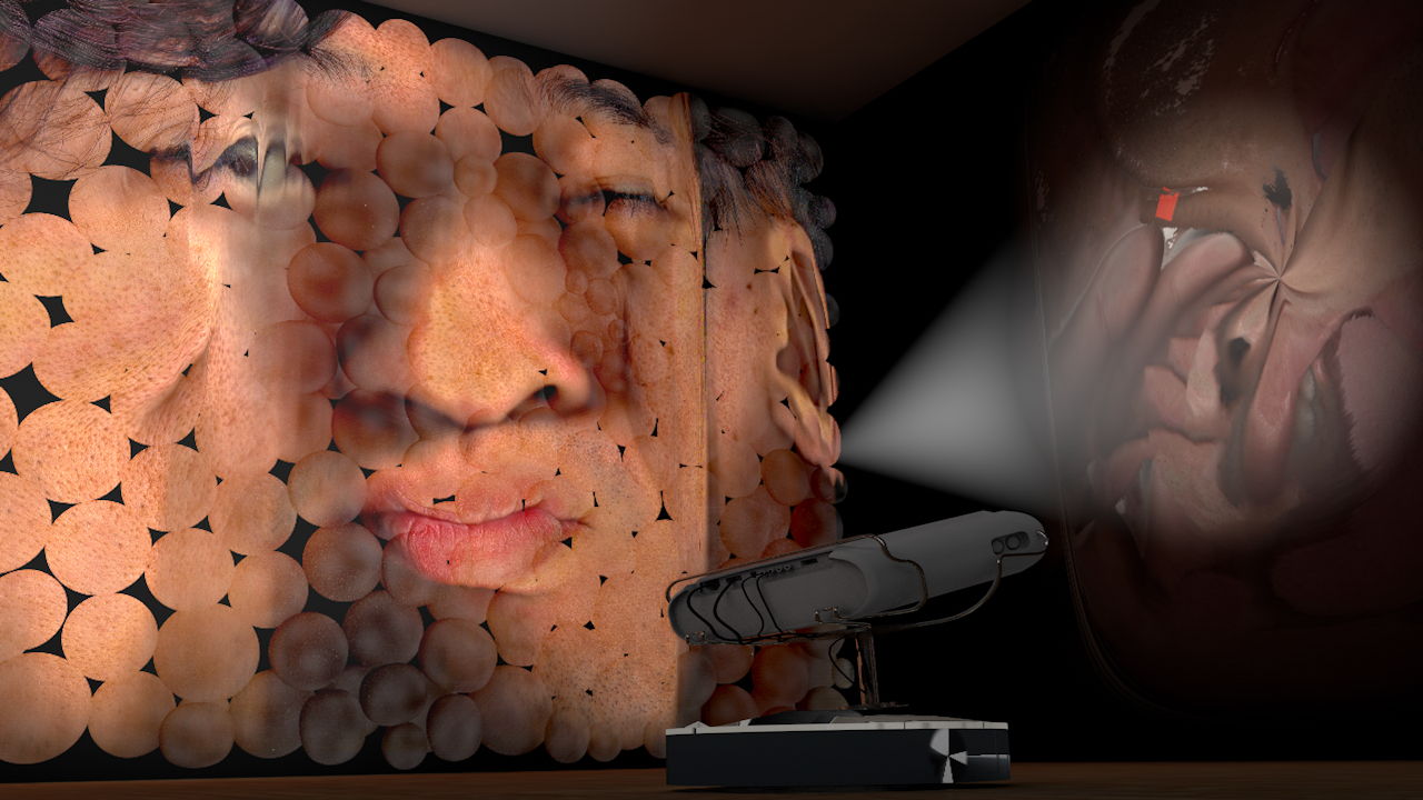日課として行なっている肌のスキャン画像と自画像クロッキーを組み合わせている。私は小学生の頃から自分の顔に興味を持ち、鏡をずっと眺め不思議に観察していた。自分の顔は、他人や鏡や写真など何かを介してようやく認識できるものだ。顔という他者と自己の媒介が、自意識を私に芽生えさせたのだ。中学生の頃からは肌にコンプレックスを抱くようになった。ニキビをたくさん潰し毛穴パックを大量に消費した。自分から出てくる物質や痕跡を消し去ろうとしたのだ。ニキビを潰す感覚は生きている自分の細胞に触れるようで興奮もした。しかし、現代の顔という象徴は抽象化してきている。カメラが高解像度化しているにも関わらず、VRやiOS12でバーチャルアバターがデフォルトに。セルフィーはInstagramのようなフィルターアプリや化粧アプリで白飛びさせている。そんな時に自分とは何か、体の意味は何なのか、身体に物質的なアイデンティティを求める自分がいた。プリクラやサラリーマン等の日本の特徴は、自己を大衆の中に溶け込ませ安心させていた。人間さえ大量生産のような、見落とせない日本の姿だ。絵の上にプロジェクションやモニターを埋め込み、美術史の理想像だった自画像手法と、現実を見せる技術を組み合わせた。TVのFHDで繊細な肌を見せるなと苦情が来る、技術と理想像の衝突がこの作品に示される。毛穴は成長するように小さく動き、理想像は時折大きく歪んだりメイクアップされる。 -