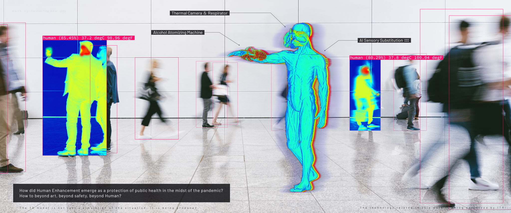 How did Human Enhancement emerge as a means of protection for public health in the midst of the pandemic? “Thermohunter_V.T.S.HAOS” is a wearable AI system that translates the result of the object detection and body temperature of people around to Braille alphabets and delivers it to the back of the wearer. It helps wearers perceive the body temperatures of people around them within 7 meters.
