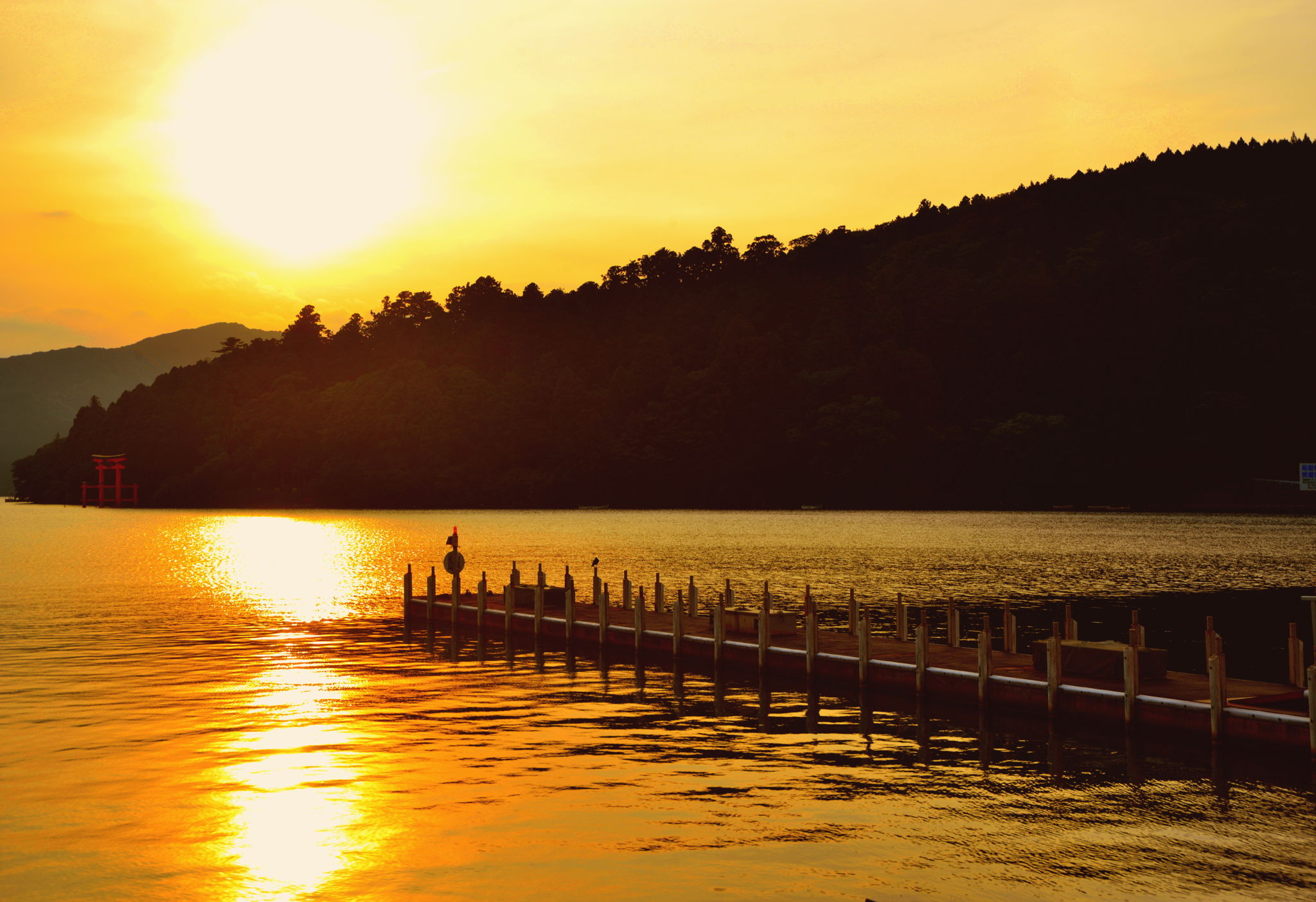 By the lighter which floats on the surface of the lake and a barge of the sun and water, a picture is taken and?