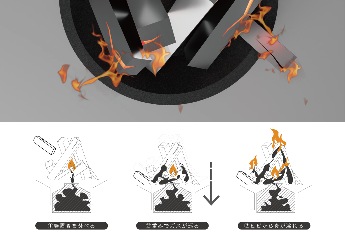 薪を組みあげたような本体と箸置きがセットになったこのプロダクトは、双方がステンレスで出来ており、それらが実際に燃えるわけではない。箸置きを焚べるとその重さに応じガスが本体を巡り、ひび割れのようなスリットから火が溢れることで実際に薪が燃えているかのようなビジュアルを生み出している。