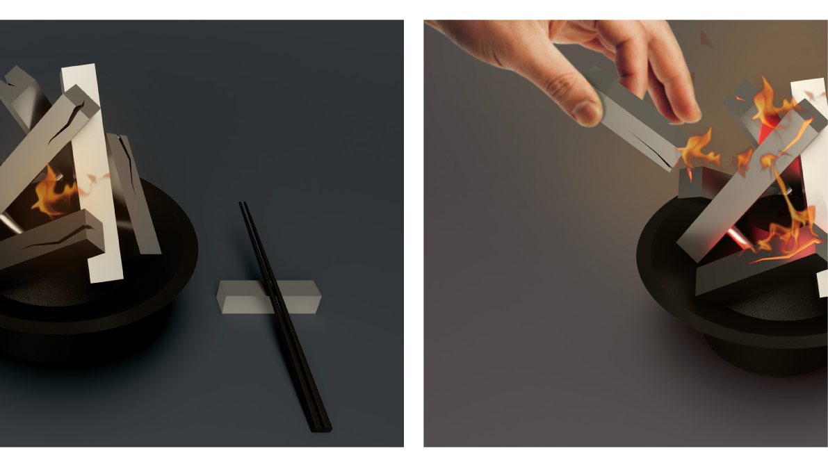 焚べるという焚き火らしい体験を与えるだけでなく、食後にその役目を失う箸置きを薪とすることで、食後の片付けの動作の中で自然と火が大きくなる。食後に生活習慣の一部として、焚き火を囲み家族で談笑する時間を作り出すプロダクト。