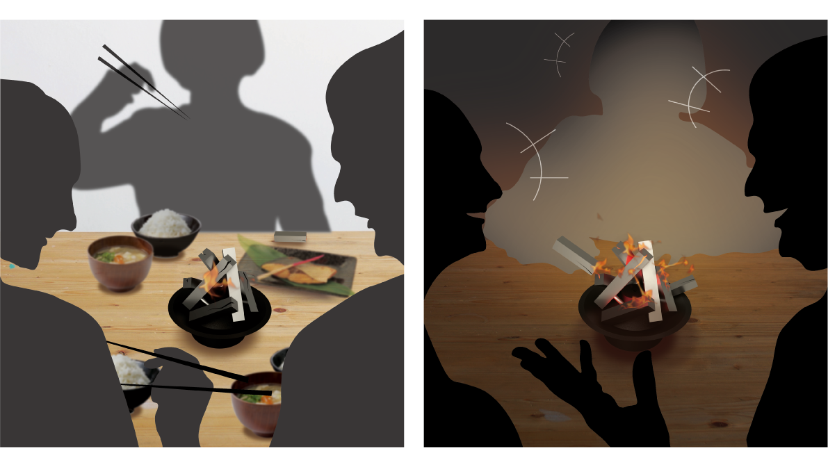 食事中はキャンドルのような小さな火が食卓を彩り、食後は箸置きを焚べることで大きな火を家族で囲む。