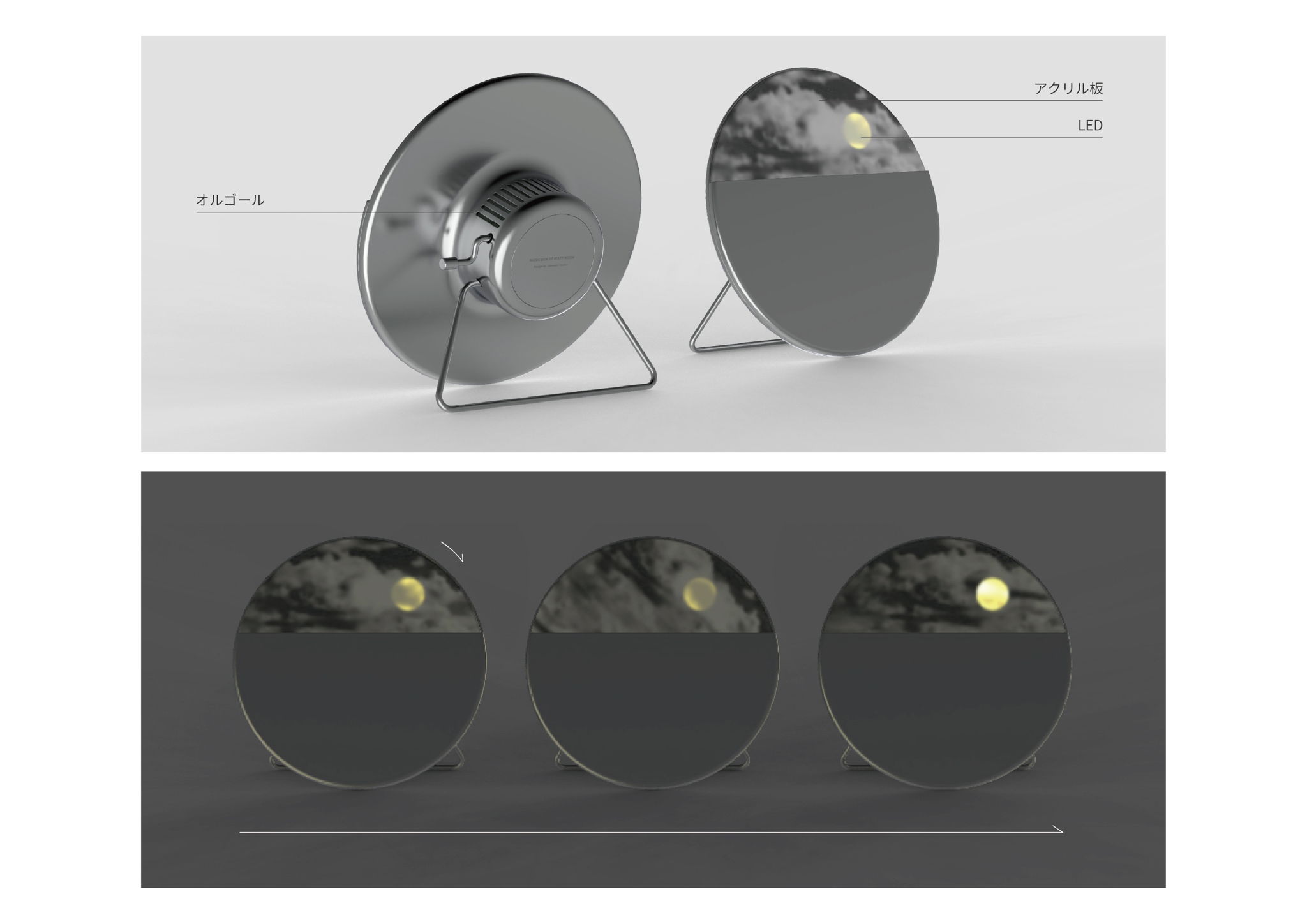 月を表す光にかかる雲が動くことで、朧月のゆるやかな時のうつろいを感じるオルゴールの提案です。