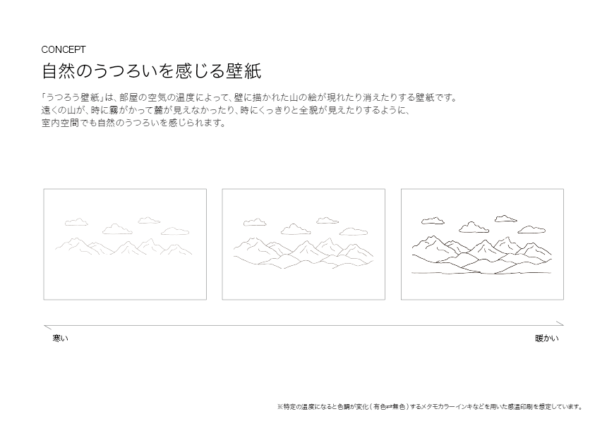 「うつろう壁紙」は、部屋の空気の温度によって、壁に描かれた山の絵が現れたり消えたりする壁紙です。遠くの山が、時に霧がかって麓が見えなかったり、時にくっきりと全貌が見えたりするように、室内空間でも自然のうつろいを感じられます。