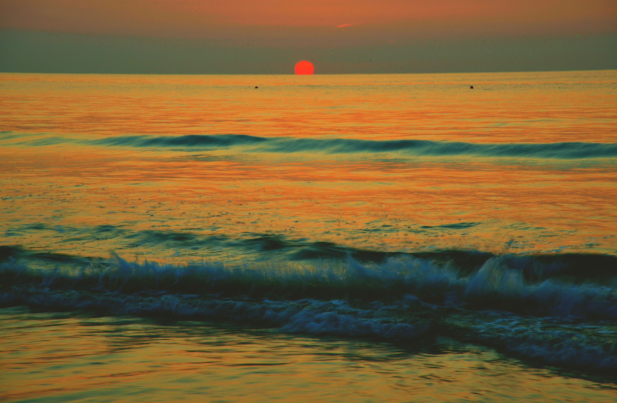 sea, wave, beach, summer, water, horizon, red tinge, take on, began, awaited, sunrise, small, sun,