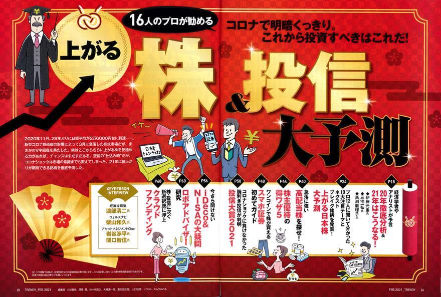 【巻頭特集】[ 上がる株&投信 大予測 ] 挿絵を描かせていただきました。