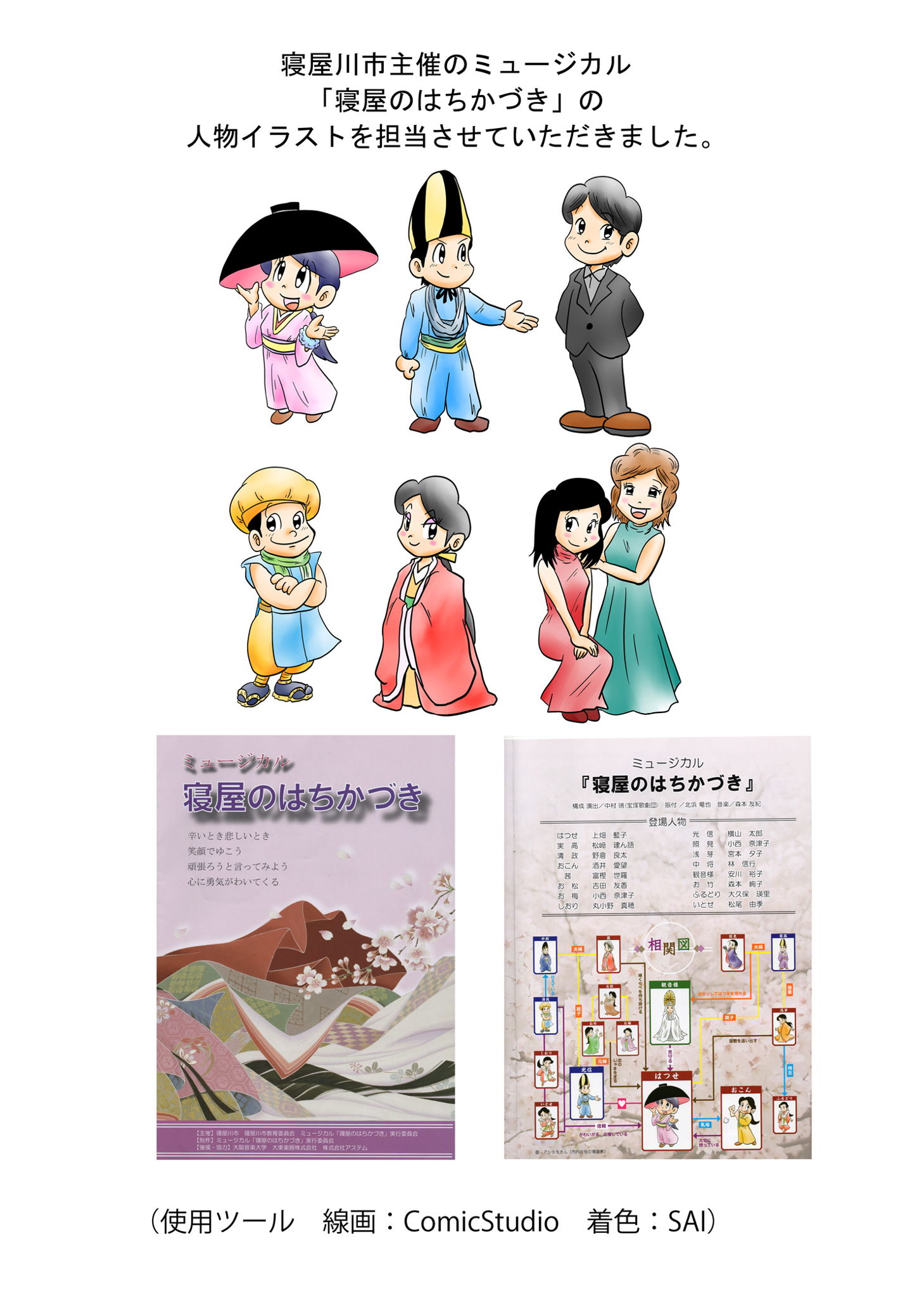 寝屋川市主催のミュージカル「寝屋のはちかづき」のキャラクターイラストを制作いたしました。