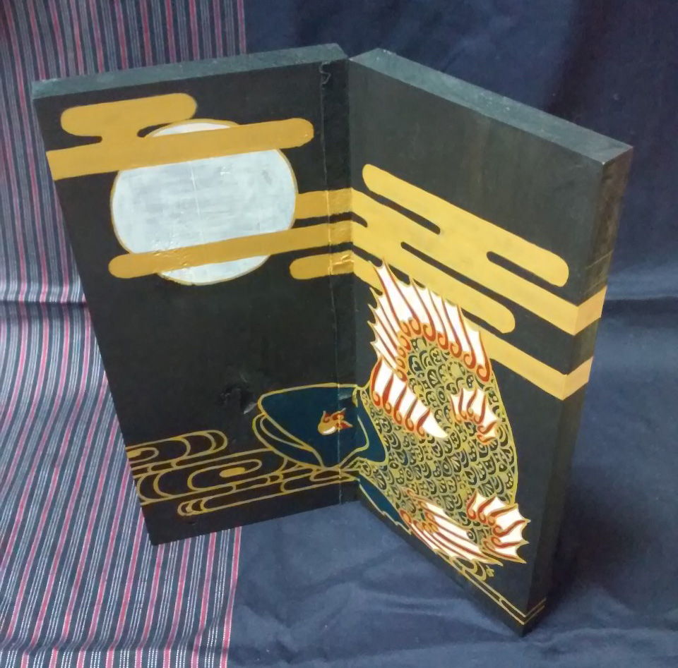 檜の板の屏風に描いた、月と和風シーラカンス。