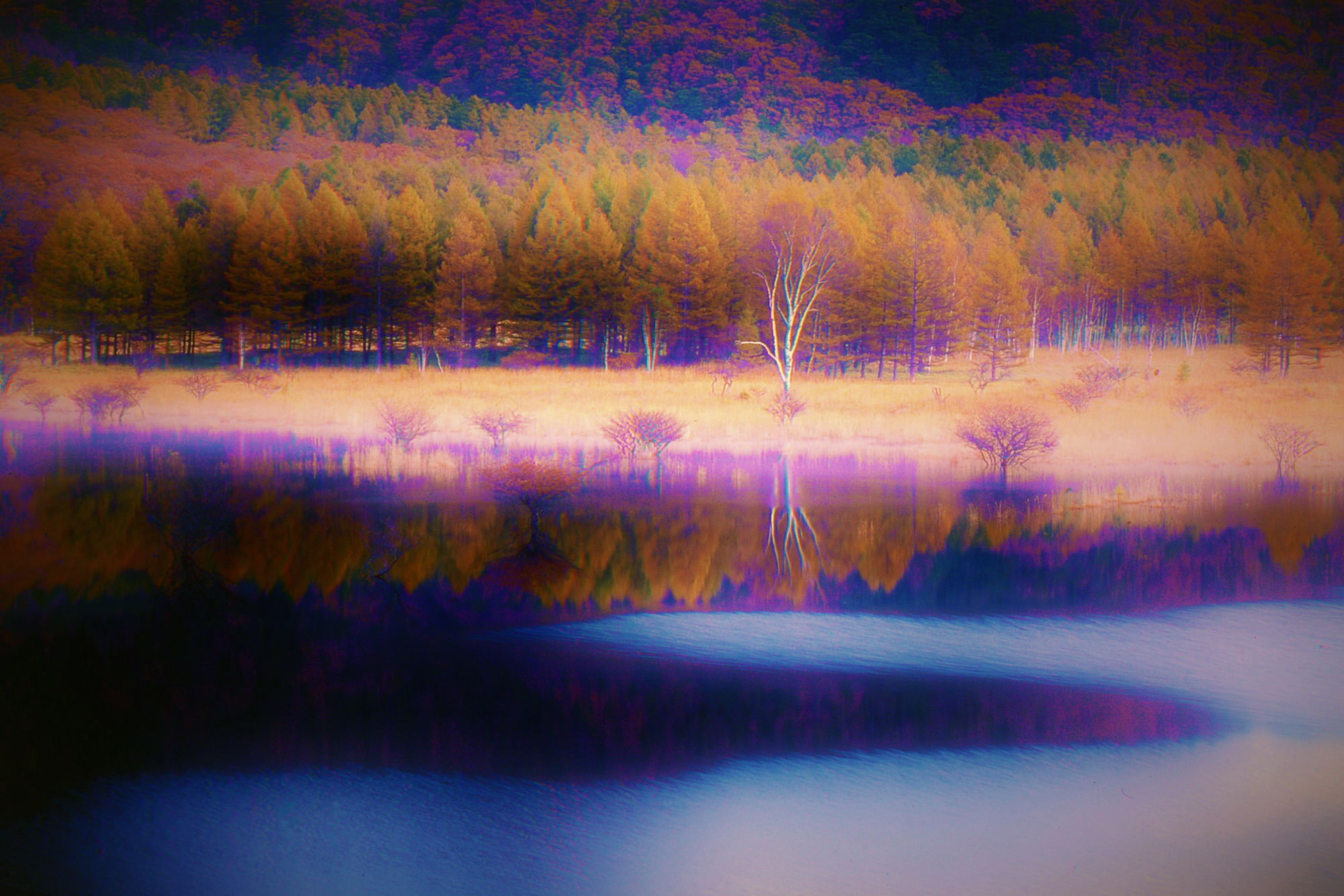 The grass leaves, and the autumn leaves of the larch tree are beautiful.