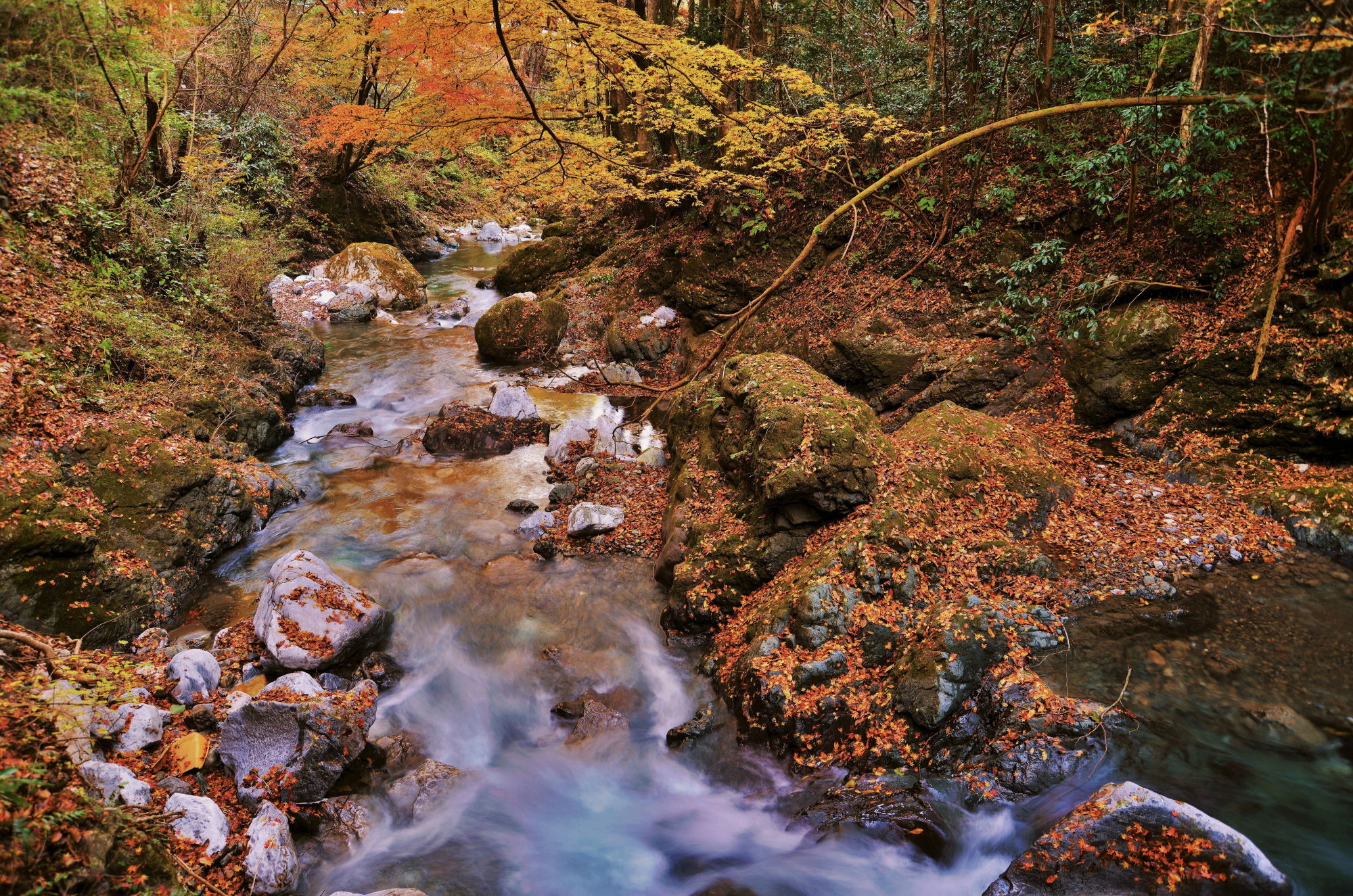 The trees with which a valley stream is surrounded give the color off clearly, the one water
