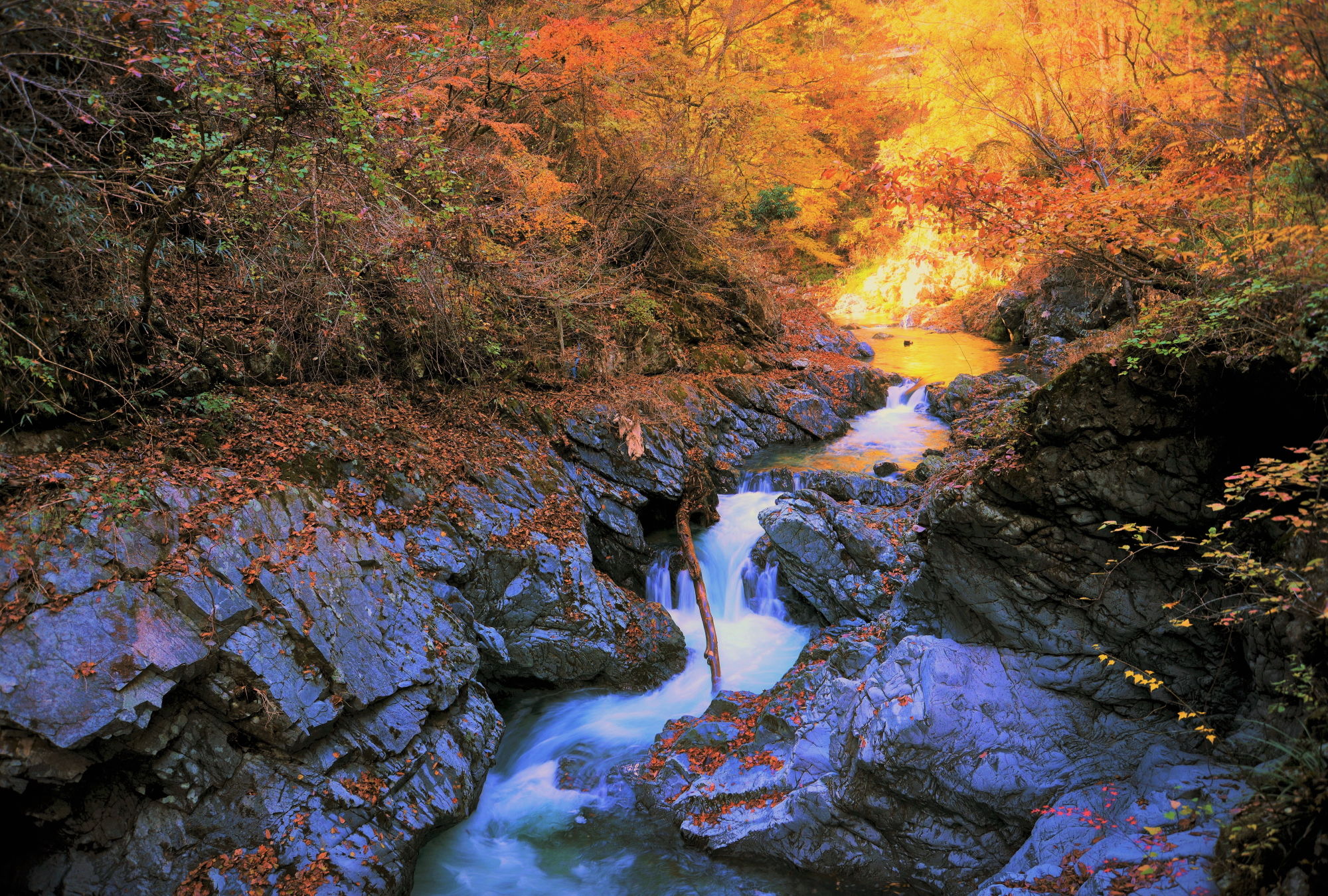 The trees with which a valley stream is surrounded give the color off clearly, the one water
