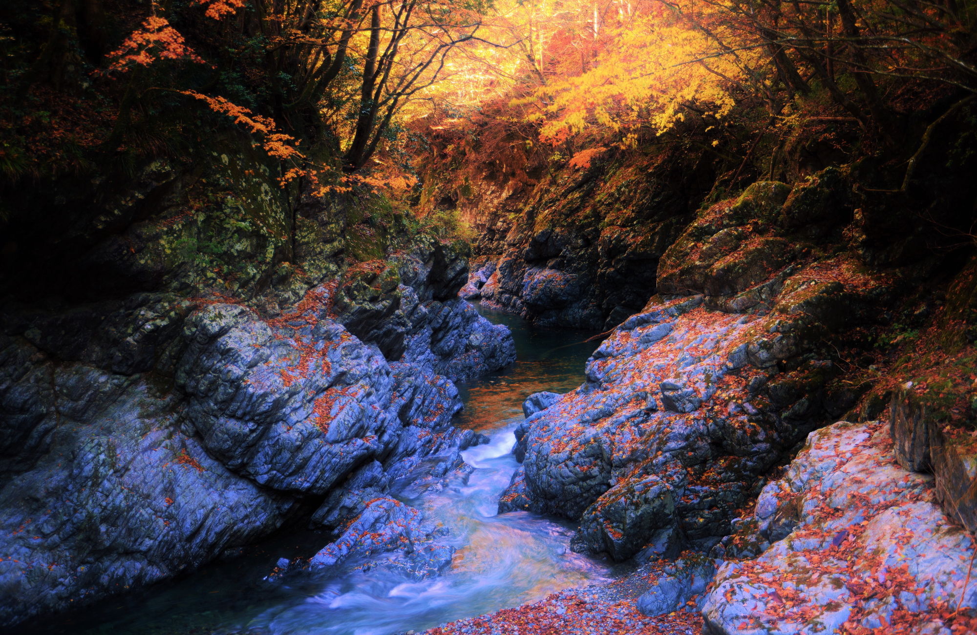 The trees with which a valley stream is surrounded give the color off clearly, the one water