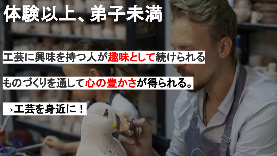 双方のニーズを解決し、新たな「趣味が工芸」という市場を作ることを週末工芸で目指します。