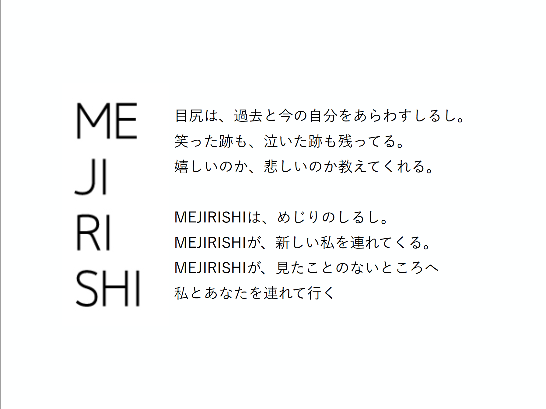 MEJIRISHIは目尻をはじめとした顔の表面に、文字を記すことを可能にするコスメです。文字やカラーをカスタムして自分らしさを表現し、伝えることができます。”目尻”という人の過去や感情を最もよく表すパーツに、言葉の表現を付加することで、個人の内面的・精神的美しさを表現できます。