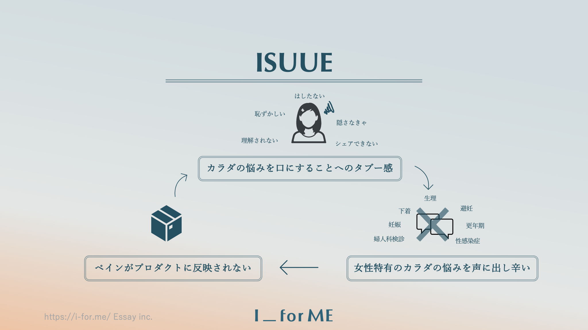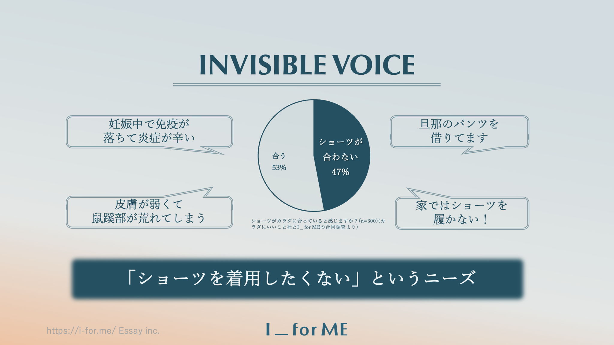 女性はホルモンの周期上、局部や鼠蹊部にかゆみが発生しやすくなっています。例えば、月経中のムレによる痒みや妊娠中の鼠蹊部のかゆみなどが挙げられます。しかし、「エロ」を求められる女性のショーツは一般的に鼠蹊部に沿い局部を圧迫する形状であり、デザイン性の高いショーツは生地が化学繊維であることも多く、更にかゆみを悪化させます。実際、私たちの調査によれば半数もの女性がショーツが体に合わないと感じています。しかし、解決策はTバック、VIO脱毛、薬の3点しかなく、どれも選択の壁が高くなっています。だからこそ局部と鼠蹊部に圧迫感のない、ショーツ機能のついた部屋着である"おかえり"ショーツは、ショーツの形状についた「女性らしさ」の固定概念を変え、局部のかゆみを解決する「気軽な手段」という新しい選択肢となるのです。