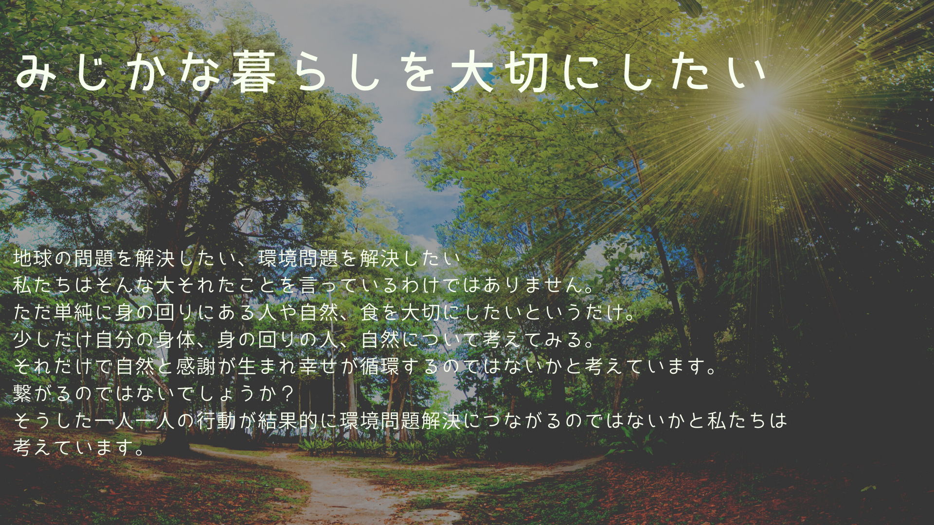 都会に住んでいると、頑張らなくてはいけない、結果を出さなくてはいけない、という見えない力によってみんなせかせか生きているように見えます。しかし本当に幸せというのはもっと身近なところにあるのではないかと私たちは考えます。