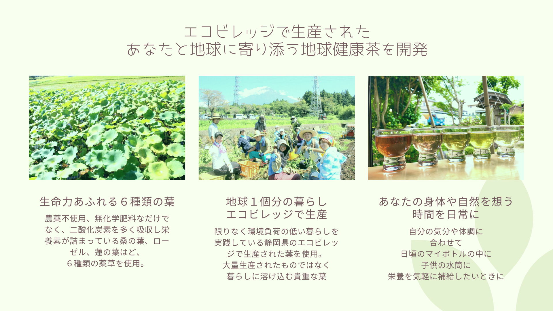 私たちは普段の暮らしからたとえ都会に住んでいても自分の健康、身近な家族、自然に寄り添うことのできるようなプロダクトを開発し、こうした価値観を広げていきたいと考えています。
