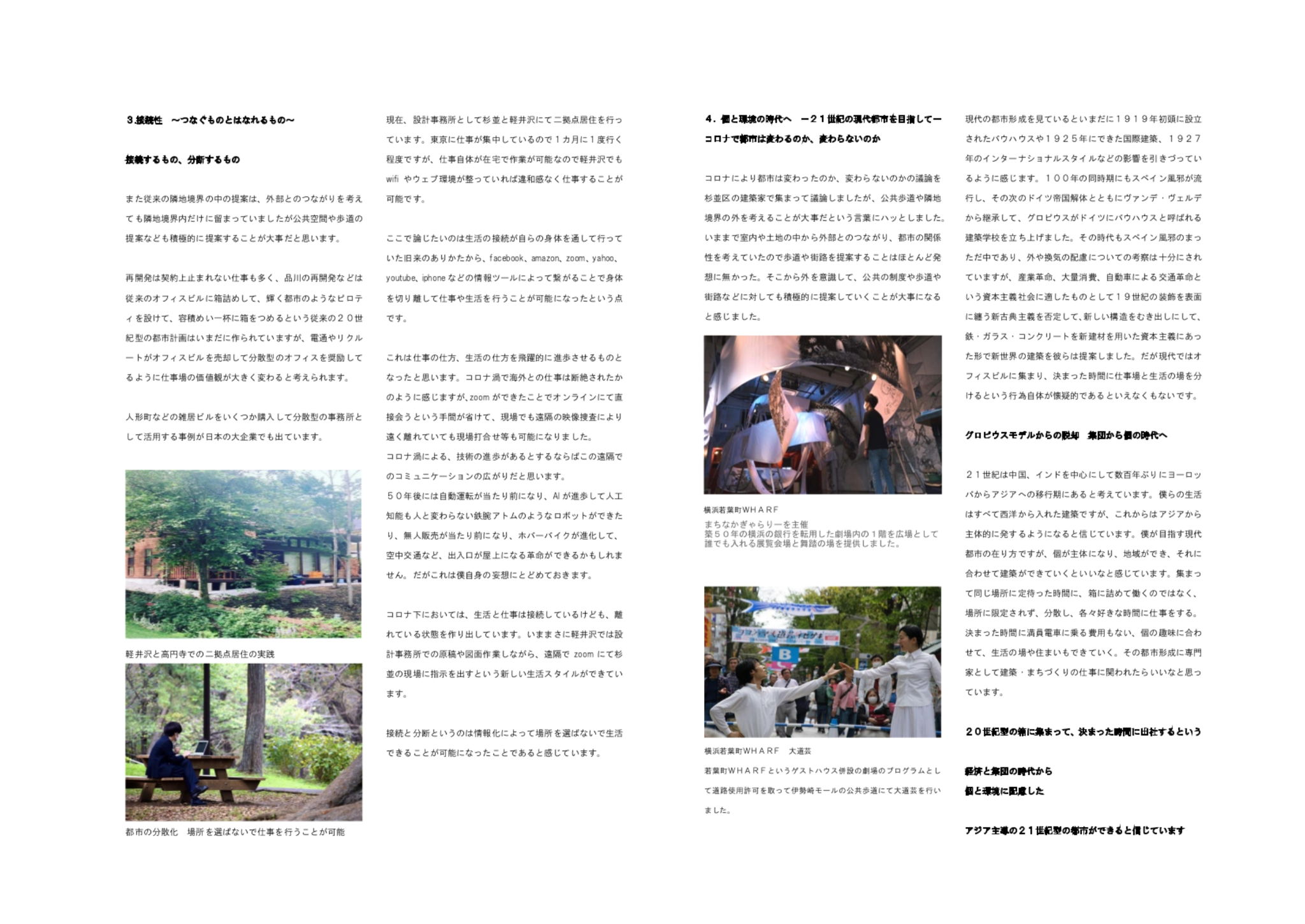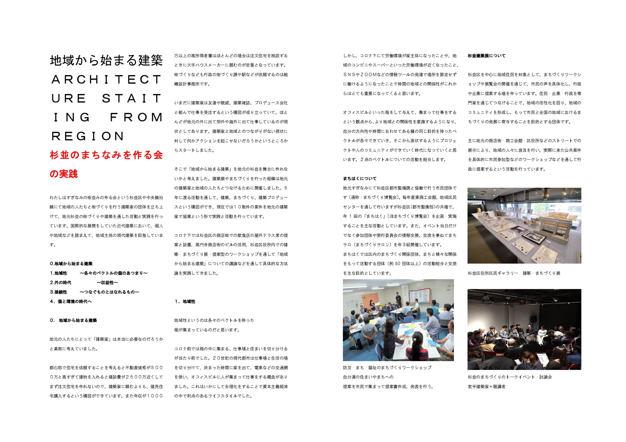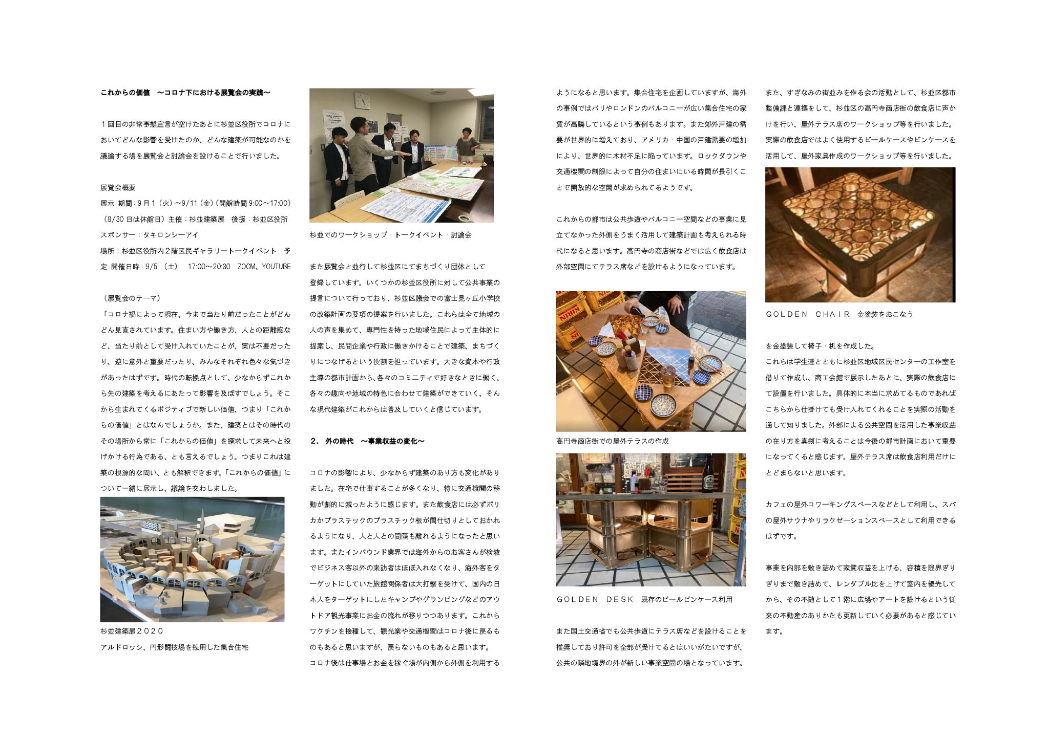 コロナ下では杉並区の商店街での飲食店の屋外テラス席の提案と設置、高円寺商店街のビルの活用、杉並区役所内での建築・まちづくり展・提案型のワークショップを通して「地域から始まる建築」についての議論などを通して具体的な方法論を実践してきました。 -