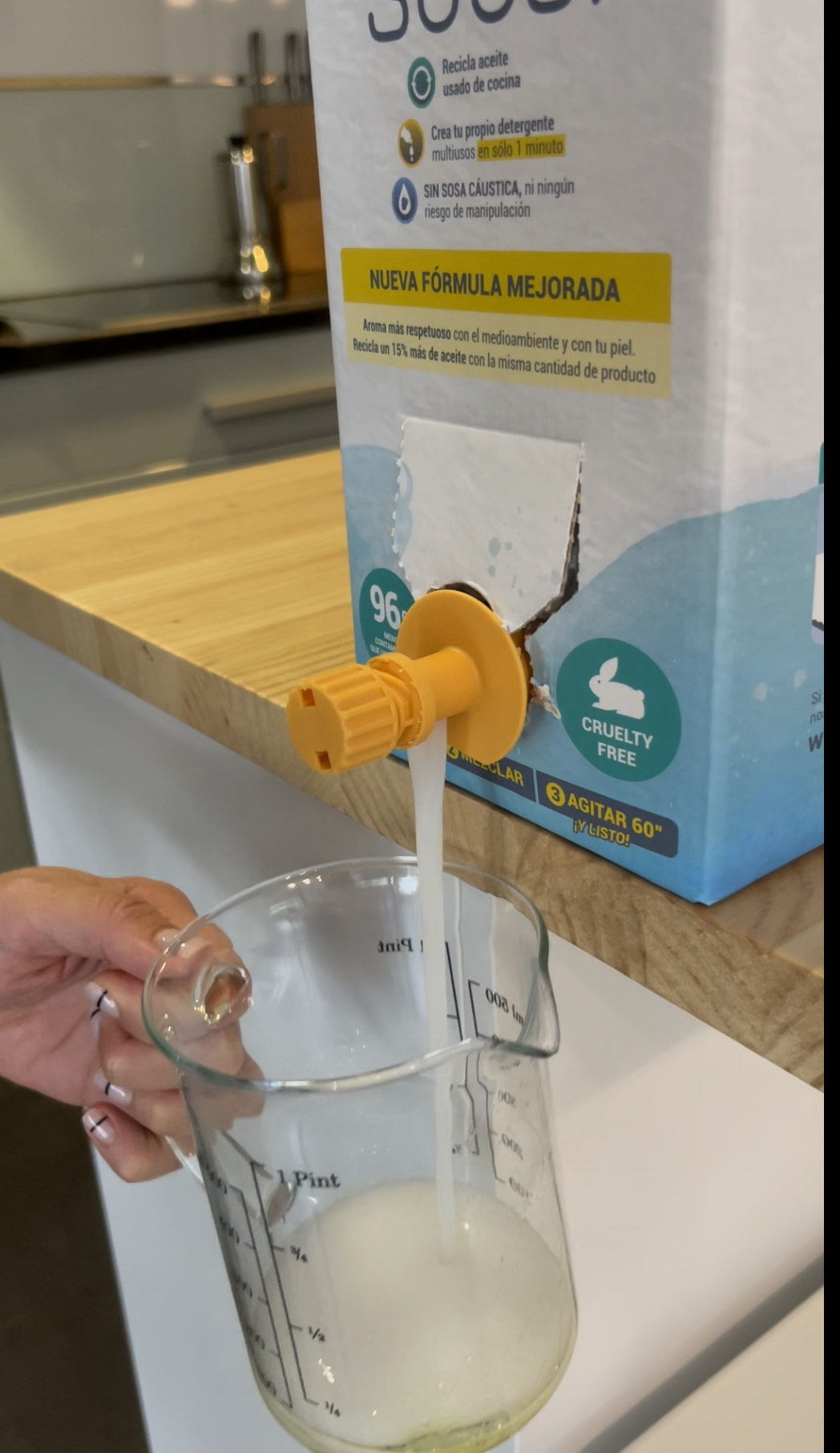 1l of used oil can contaminate up to 1,000,000 l of water (DEFRA) Only in Spain 150 thousand tons of oil waste are generated and more than 60% falls directly into the sewer, causing the death of thousands of species, and increasing 7 times the cost of water treatment. For this, and based on the old method of making soap with caustic soda, we spent 3 years of research to create a liquid without manipulation risks that would achieve the saponification reaction (transform a fatty acid into soap) in just one minute, with pleasant aroma and useful in multiple cleaning uses. (Floor scrubbers, dishwasher and laundry detergent) Thus, any person or establishment can carry out circular economics from the source, recycle used oil, reuse it, transforming it into ecological detergent, and reduce the impact of oil, common detergents and traditional packaging. In 3 simple steps, measure, mix, shake and go.