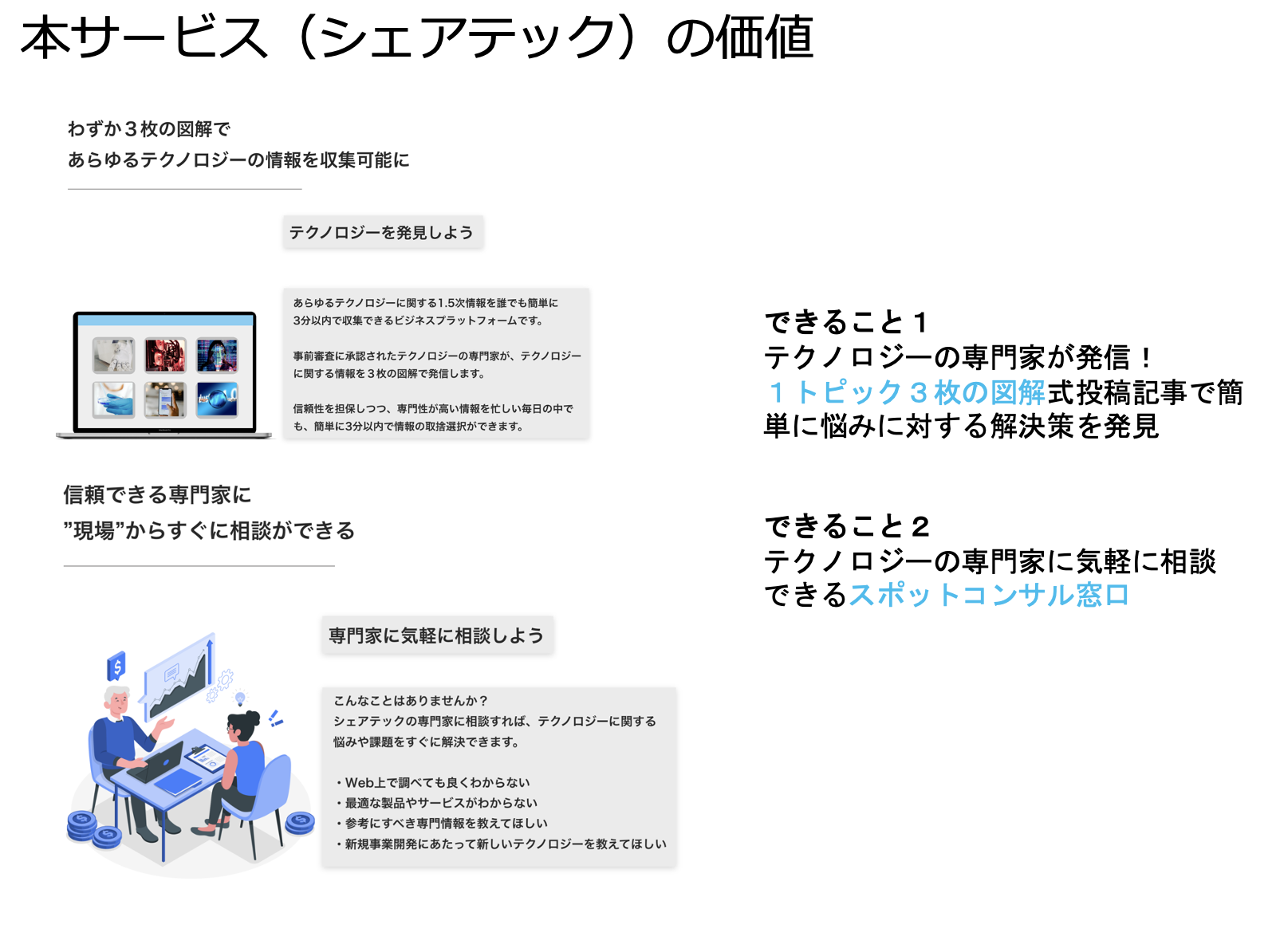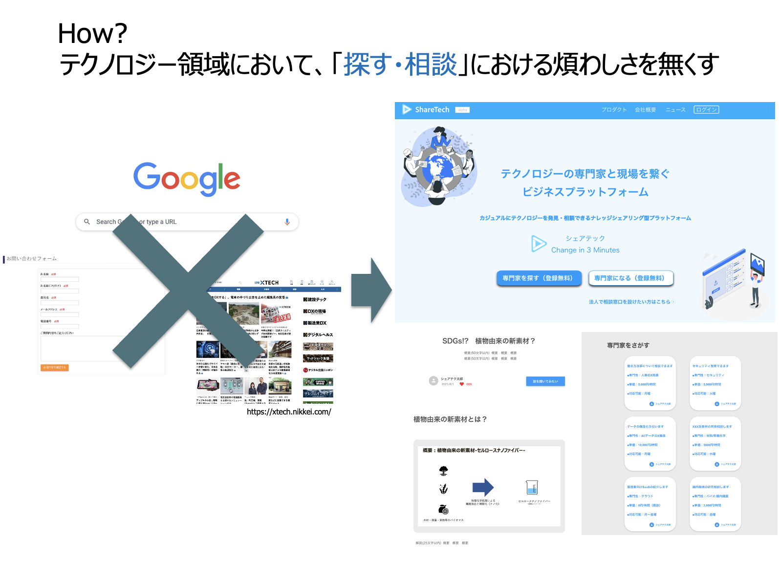そこで私たちは本プロジェクトで、テック企業営業の現場で実感した「探す・相談」における煩わしさを解決すべく、利用者にとって最適なテクノロジーの発見と相談ができる、テクノロジーの専門家と現場を繋ぐ ビジネスプラットフォーム「シェアテック」というサービスのアルファ版ローンチを目指します。