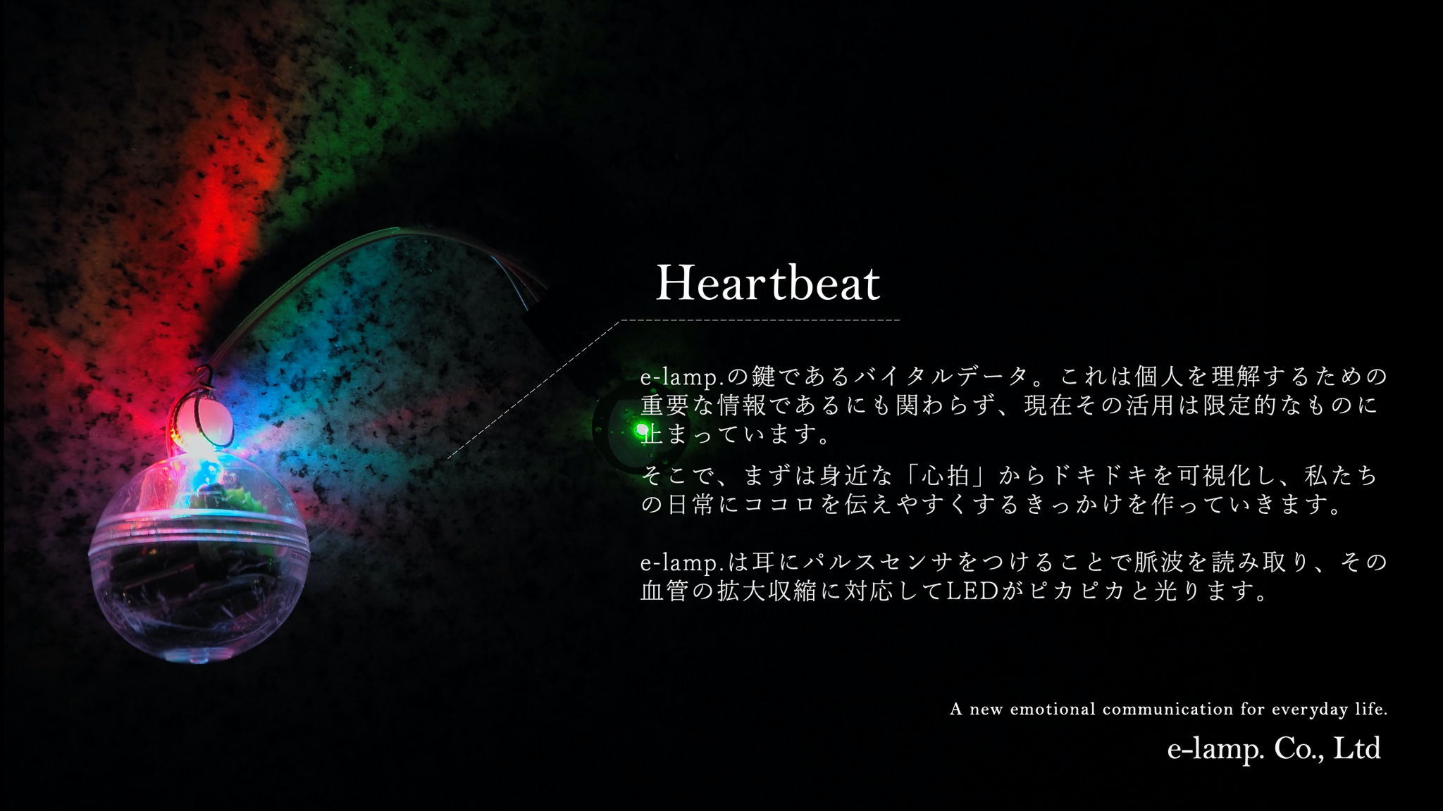 日常に、新たな感情コミュニケーションを。これまでわからなかったココロを「認知」し、これまで伝えられなかったココロを「共有」するために、心拍のバイオフィードバック体験を、光で可視化します。