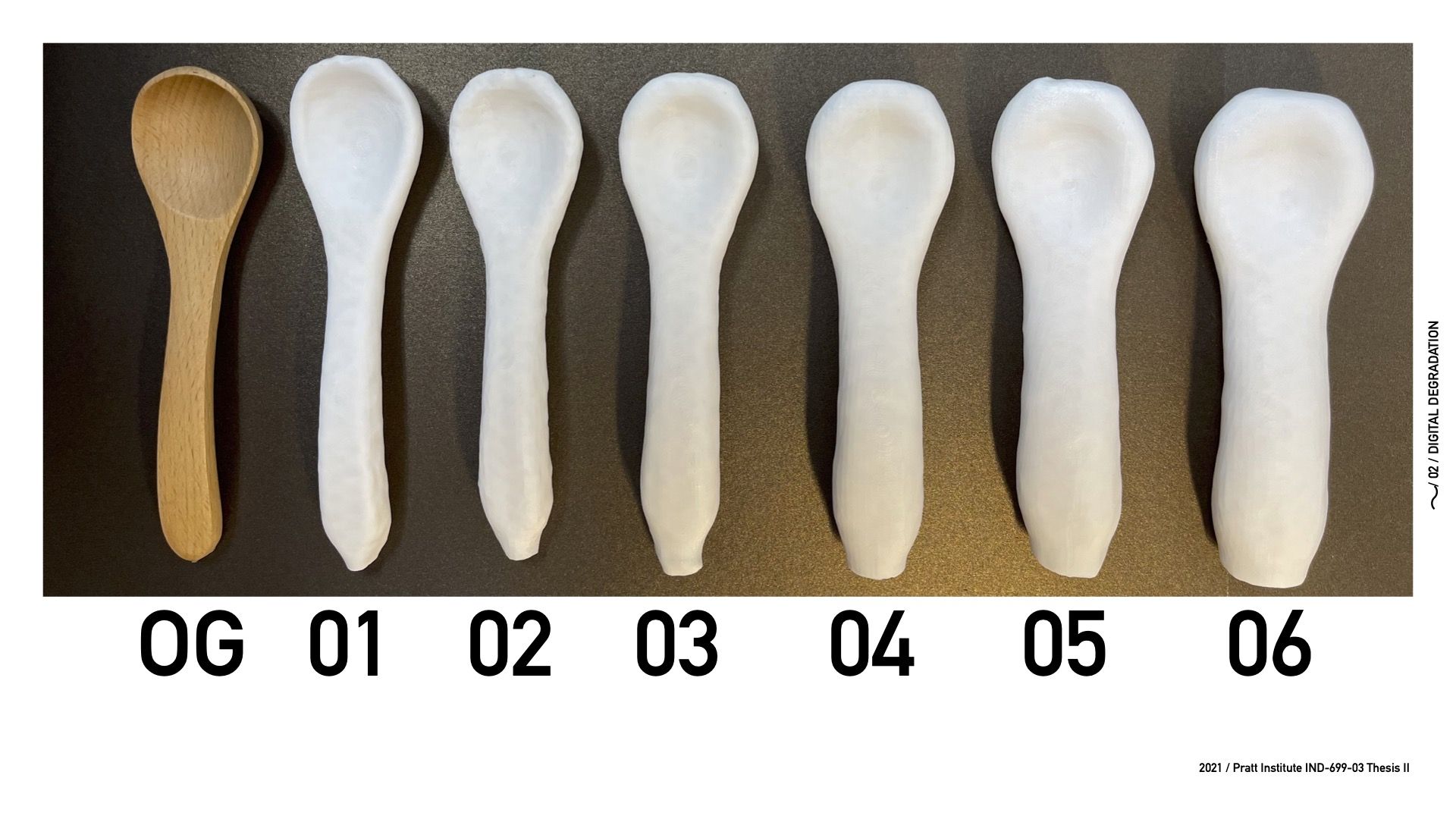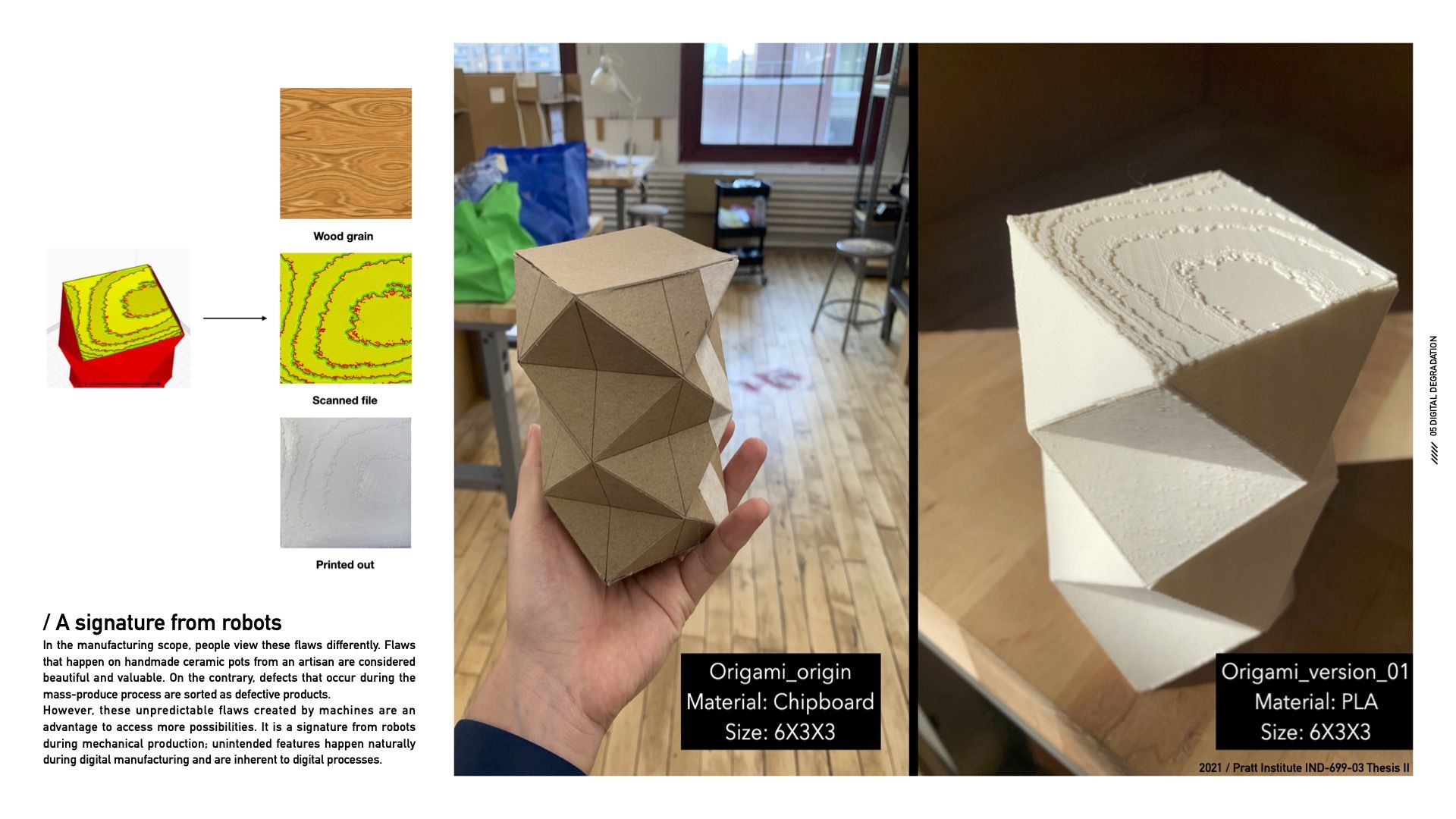 This research, “Digital Degradation,” critiques mass-produced products targeting cheaper, faster manufacturing. In contrast to mass-production, handcraft has always been an attractive way of manufacturing products. The uniqueness of flaws inherent in handmade works is perceived to add rather than diminish the value. Attempts at digitizing or mass creating this same sort of mark have often been critiqued as a pastiche reference to handmade products, building in the same flaw into every product.
