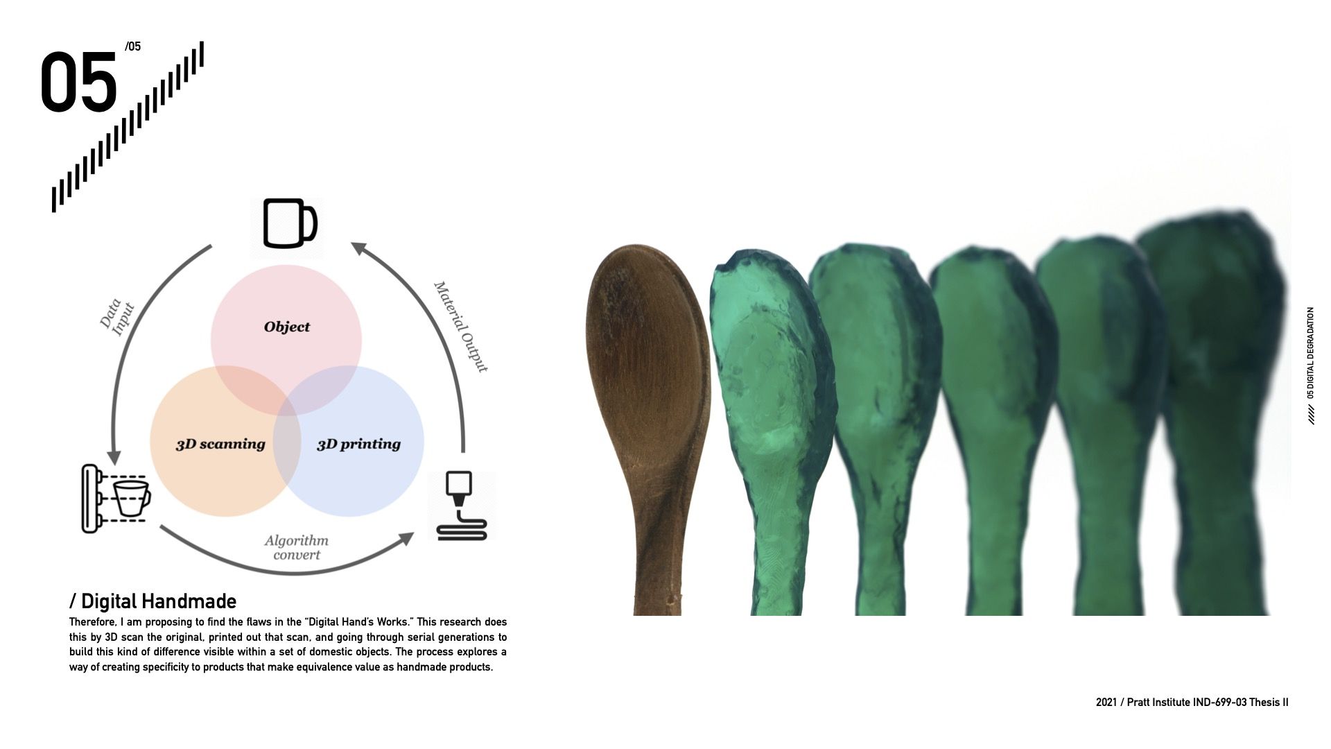 Therefore, I am proposing to find the flaws in the “Digital Hand’s Works.” This research uses the three-dimensional scanner to scan the original, printed out that scan, and going through serial generations to build this kind of difference visible within a set of domestic objects. The process explores a way of creating specificity to products that make equivalence value as handmade products. -